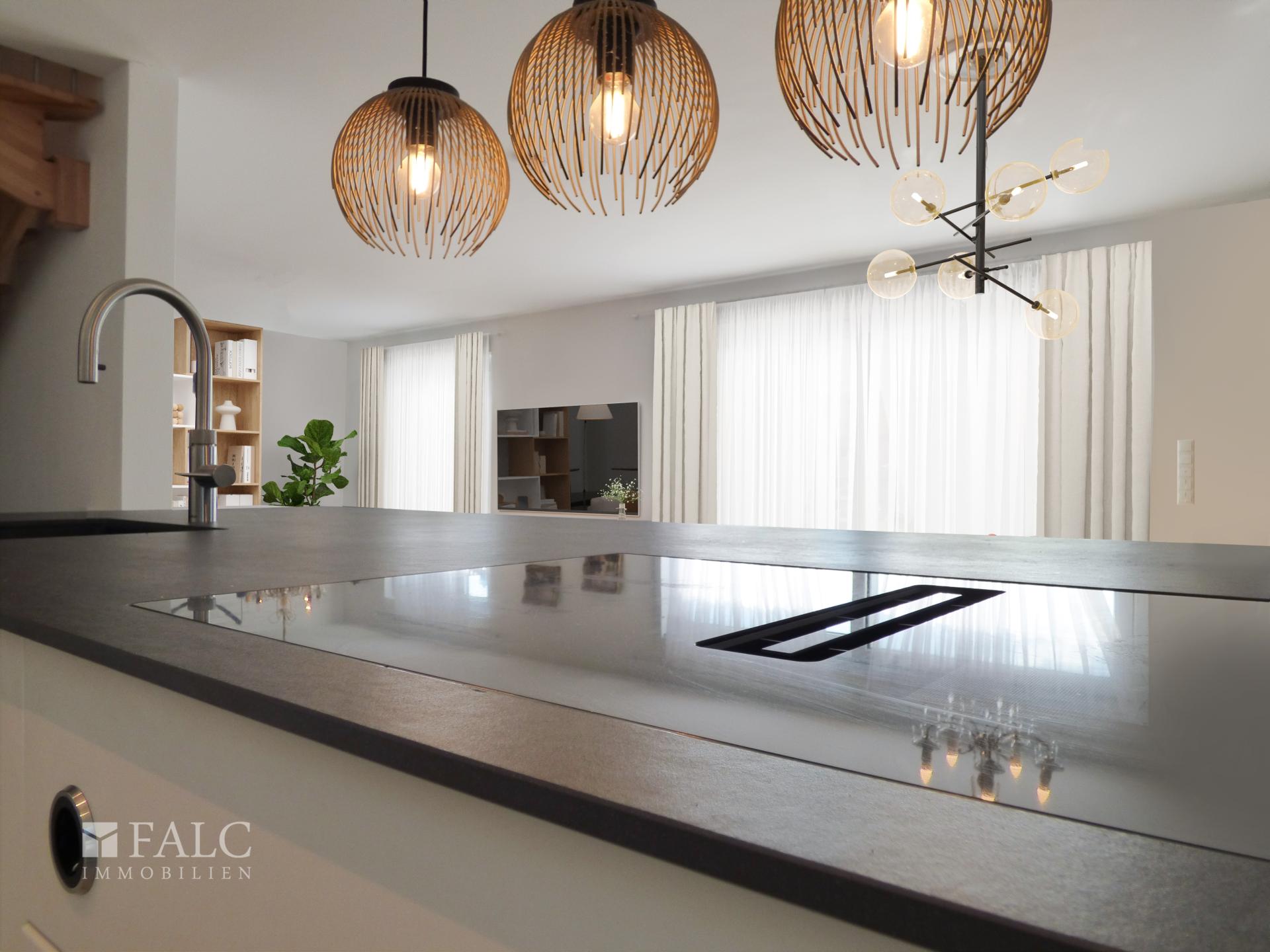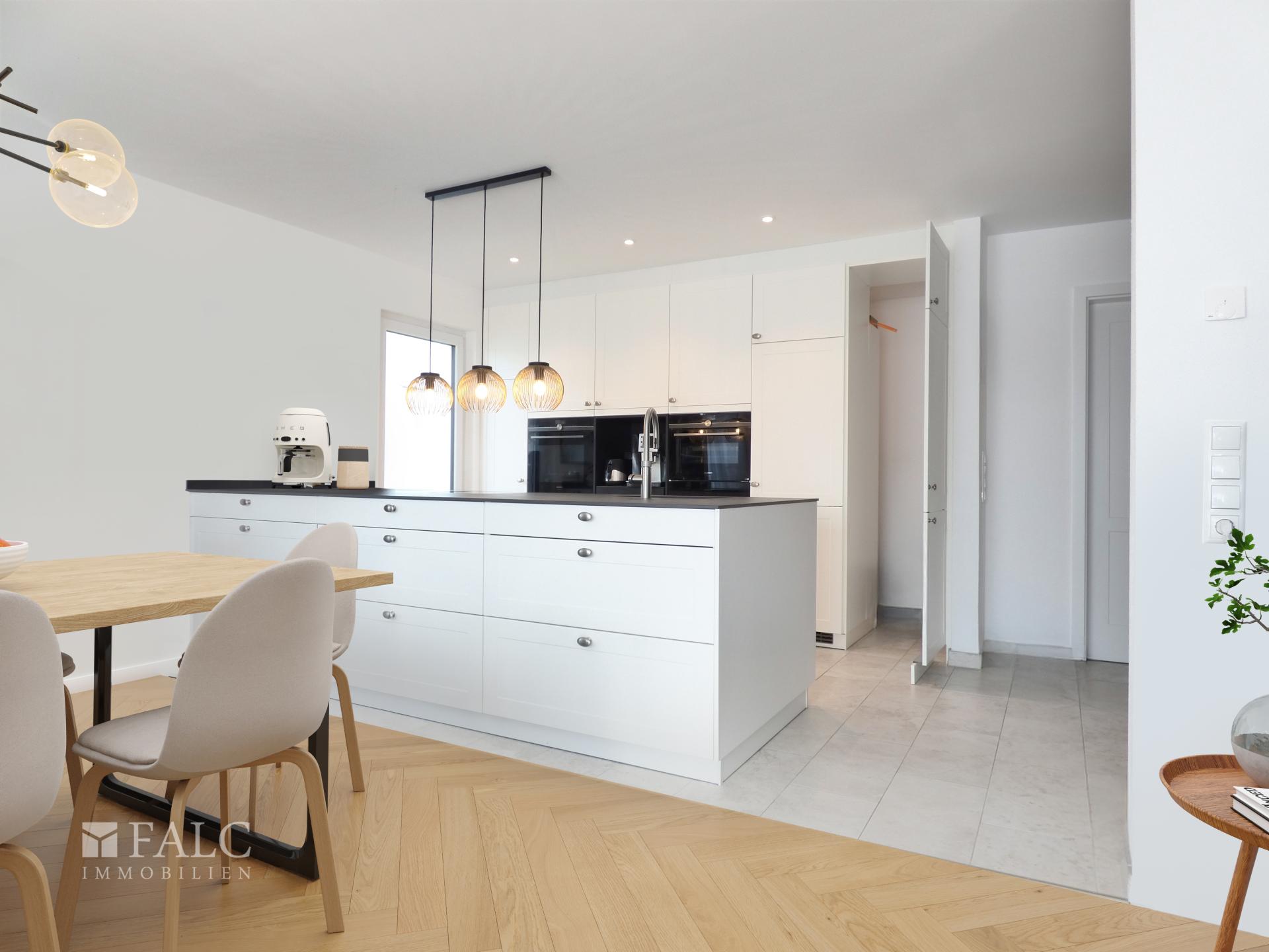 Die exklusive Einbauküche ist ein Highlight des Hauses. Sie ist mit hochwertigen Geräten ausgestattet und bietet viel Stauraum sowie eine großzügige Arbeitsfläche. Die offene Gestaltung ermöglicht einen nahtlosen Übergang zum Essbereich, ideal für gesellige Kochabende.
