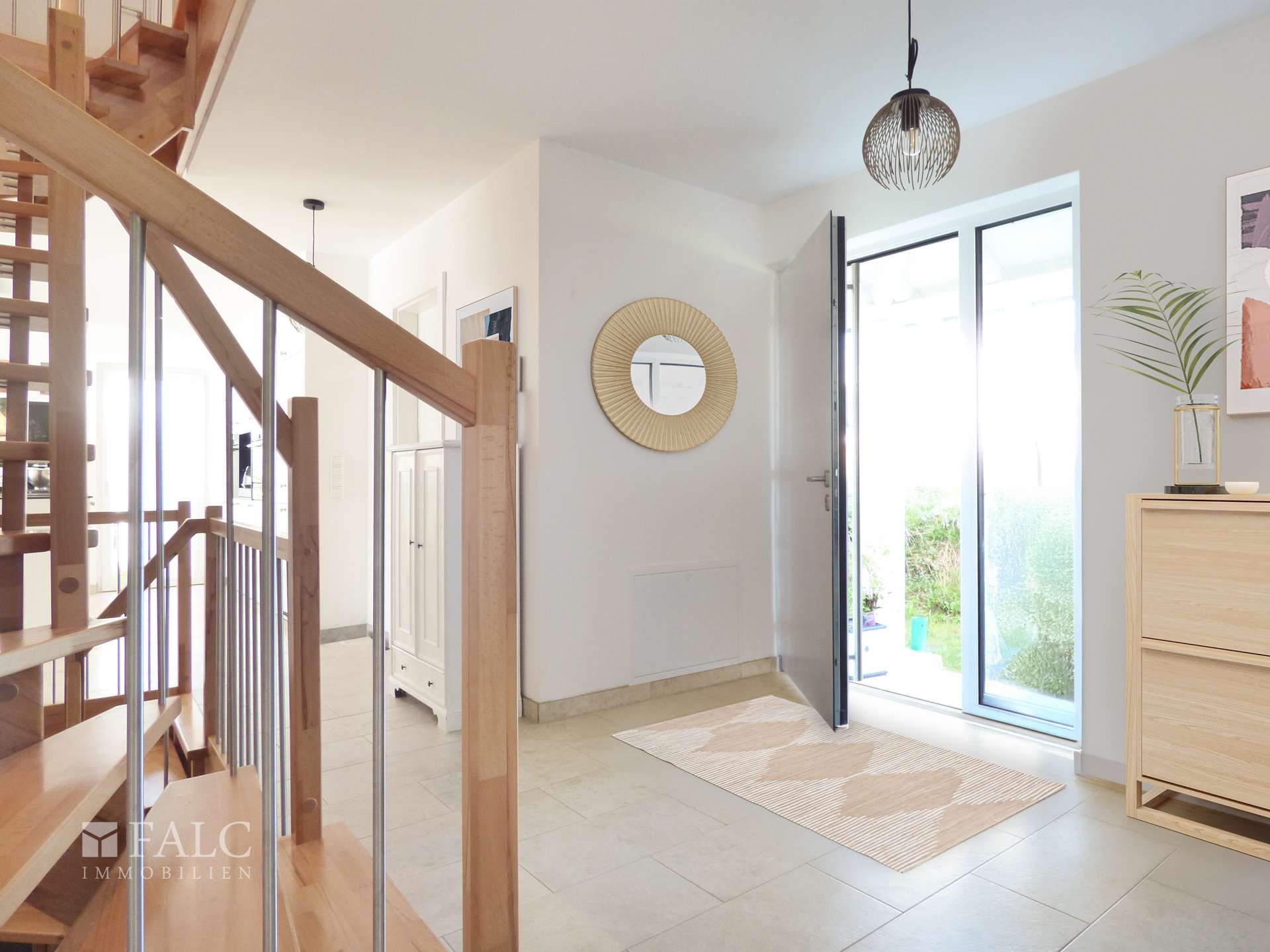 Beim Betreten des Hauses empfängt Sie ein einladender Eingangsbereich, der mit hellen Fliesen und einer modernen Treppe ausgestattet ist. Von hier aus gelangen Sie direkt in den großzügigen Wohn- und Essbereich, der durch große Fensterfronten viel Tageslicht bietet. Der Raum ist offen gestaltet und bietet ausreichend Platz für gemütliche Abende mit der Familie.
