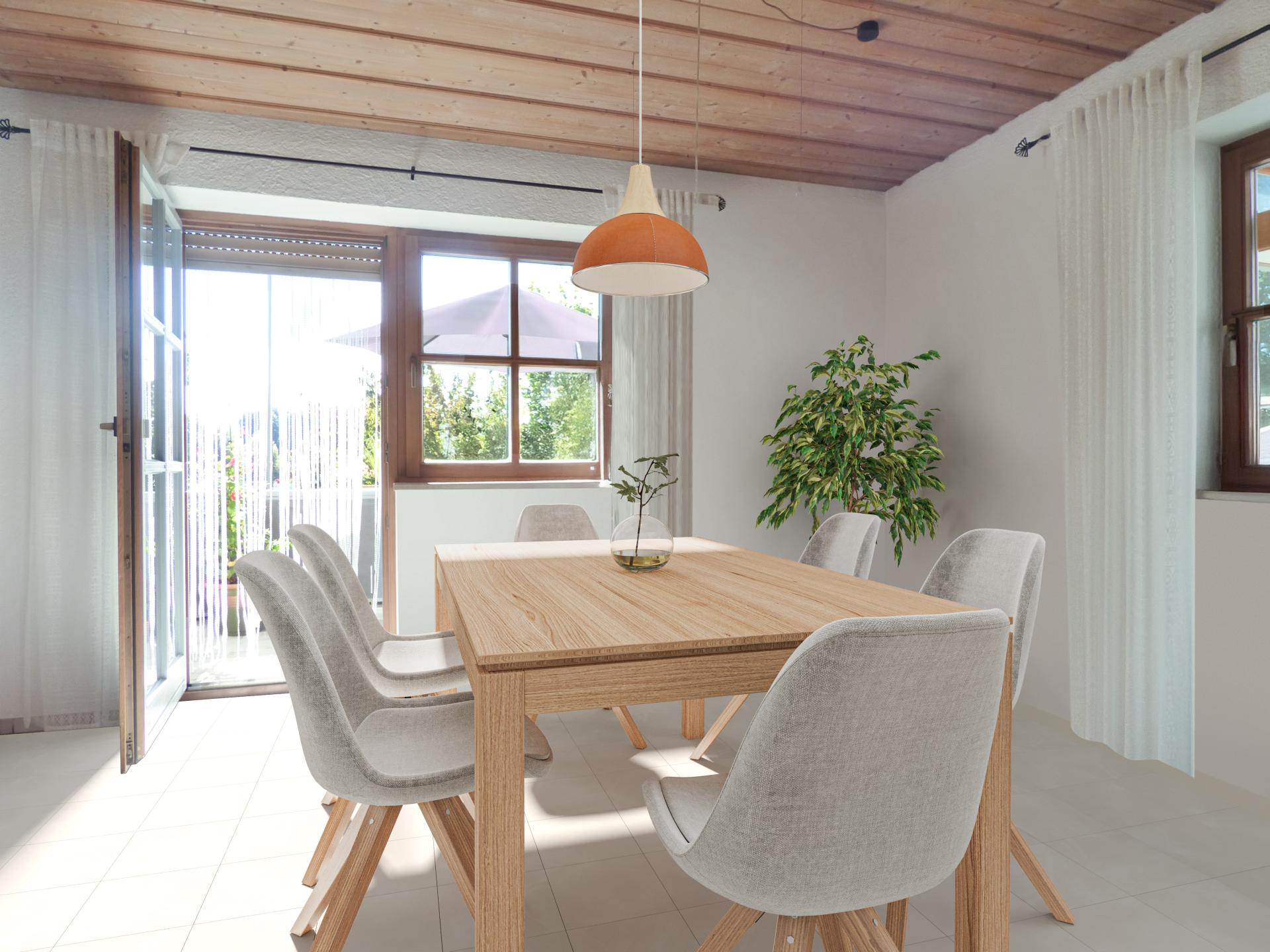 Angrenzend finden Sie das Esszimmer, das durch große Fenster viel Tageslicht bietet und einen direkten Zugang zum Balkon ermöglicht. Der Balkon bietet einen herrlichen Ausblick und ist ideal für entspannte Stunden im Freien.