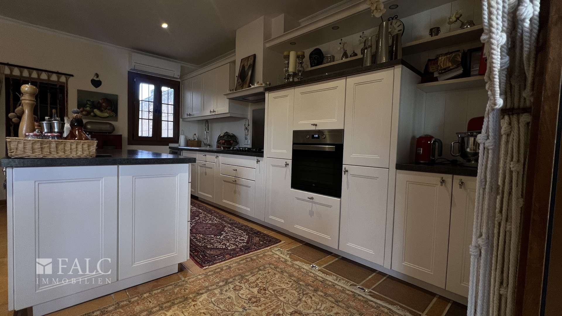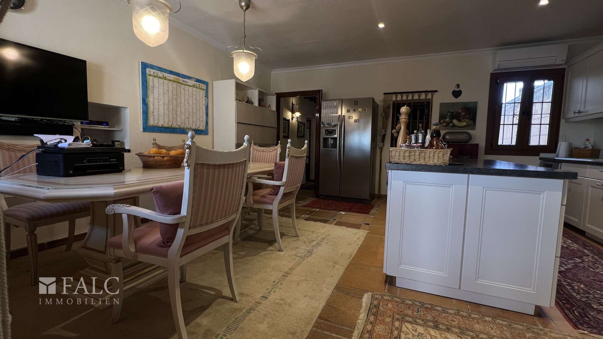 Das Haupthaus verfügt über fünf geräumige Schlafzimmer und drei edle Bäder und ist ideal auf die Bedürfnisse einer modernen Familie zugeschnitten. Im Zentrum steht der lichtdurchflutete Wohnbereich mit offenem Kamin, der durch große Fenster einen herrlichen Blick auf die weitläufige Gartenanlage freigibt. Hier können Sie entspannte Stunden genießen und unvergessliche Momente mit Familie und Freunden verbringen. Die hochwertig ausgestattete Nolte-Küche mit direktem Zugang zur Terrasse und dem 70 m² großen Pool lässt keine Wünsche offen – perfekt für gesellige Nachmittage und sommerliche Dinnerabende.