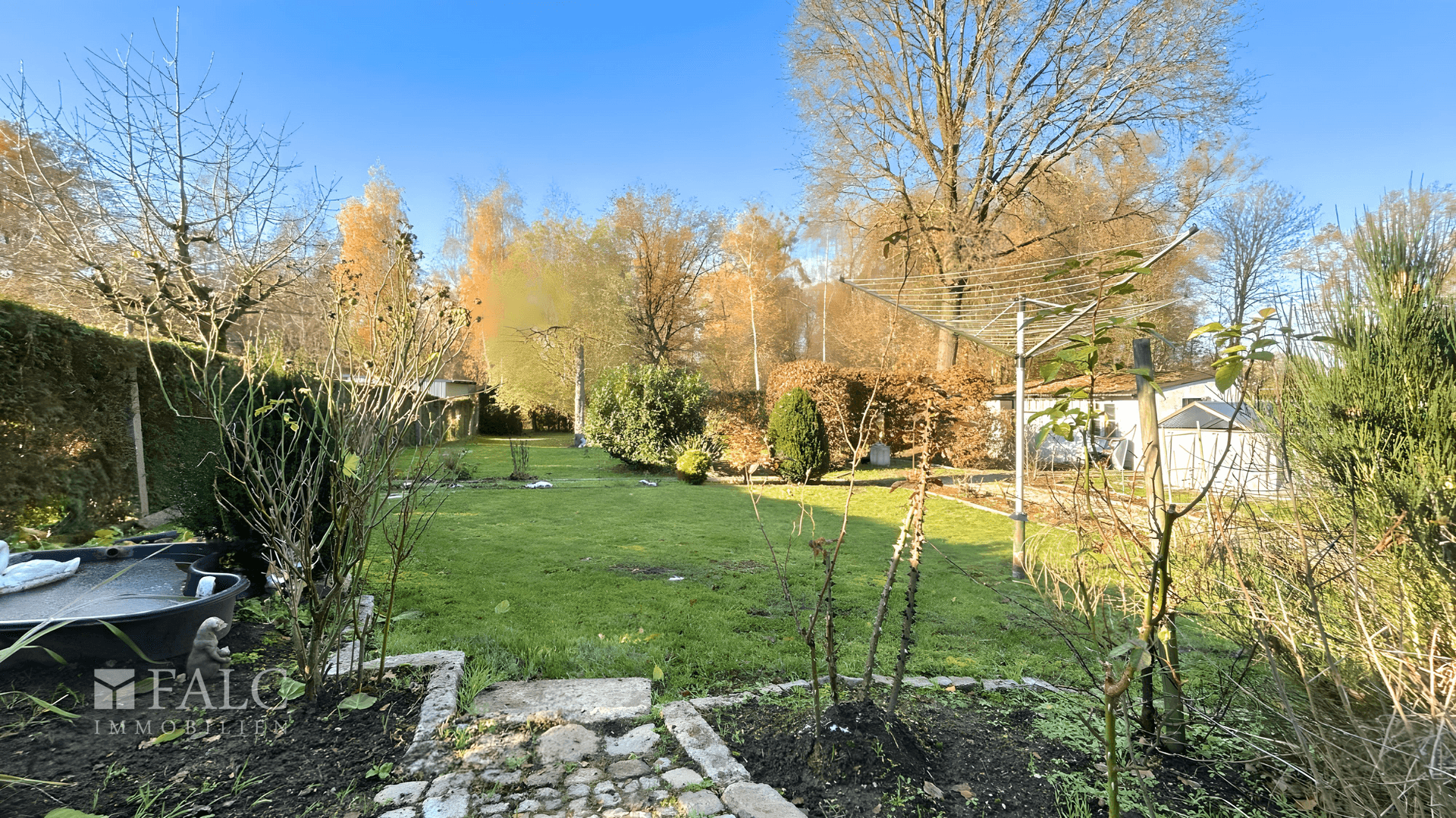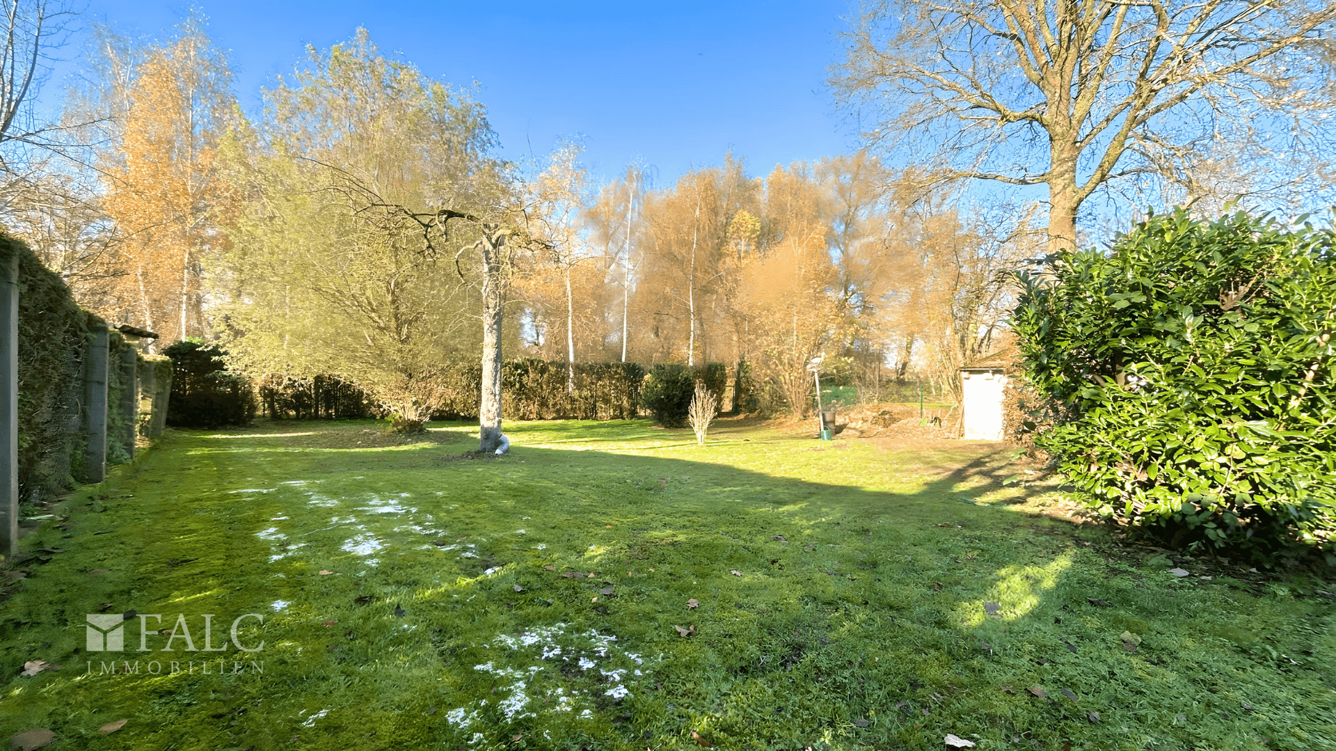 Der weitläufige Garten beeindruckt mit seiner Großzügigkeit und bietet viel Platz für Freizeitaktivitäten oder entspannte Stunden im Grünen. Ein separater Schuppen sorgt für zusätzlichen Stauraum für Gartengeräte oder Hobbybedarf. Zur Villa gehört zudem ein Carport mit integriertem Geräteschuppen, der praktischen Platz für Fahrräder und weiteres Zubehör bietet.
