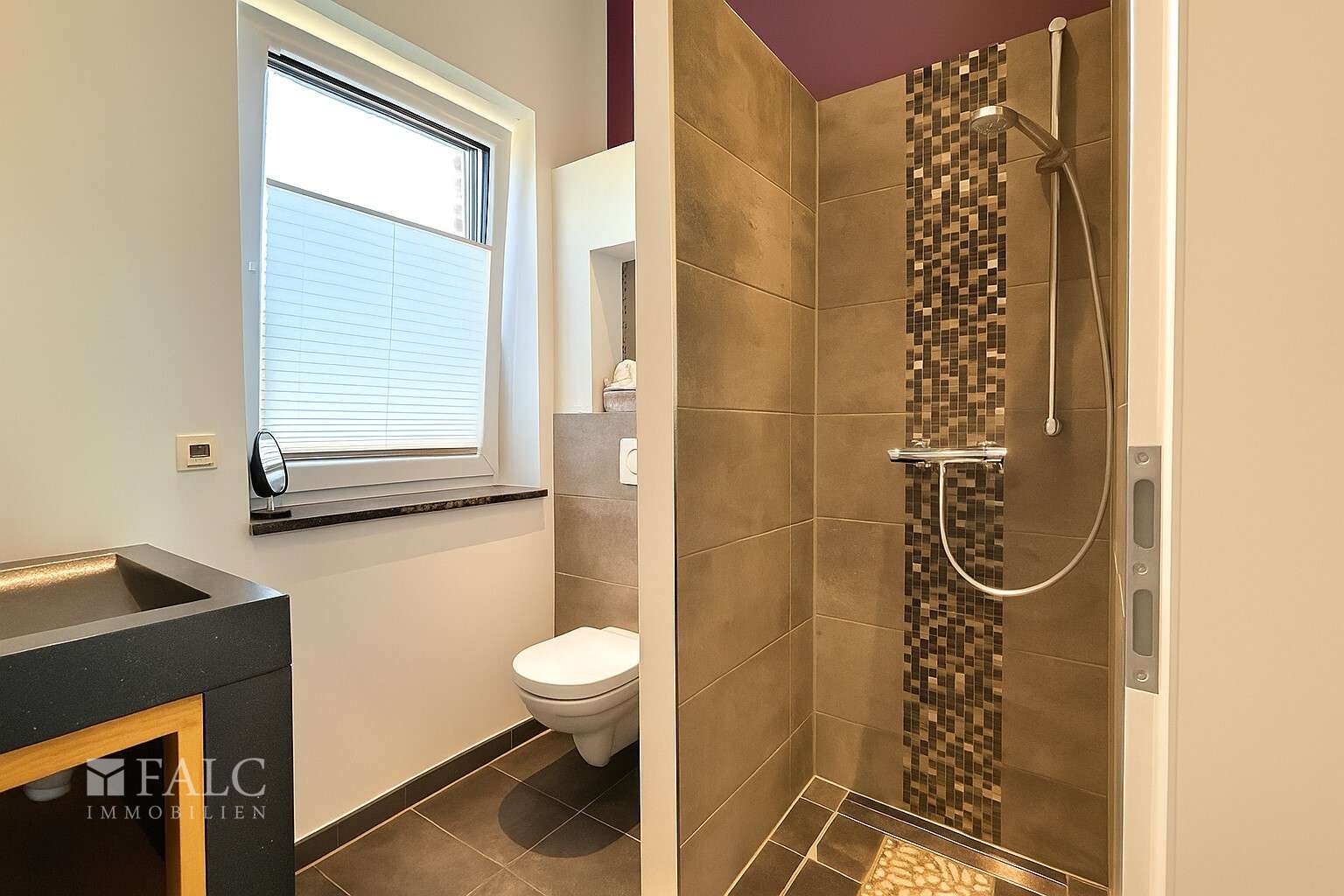 Über die Treppe im Eingangsbereich gelangen Sie in das Obergeschoss, das mit einem großzügigen Schlafzimmer, einem Kinderzimmer und einem weiteren Raum, der aktuell als Ankleidezimmer genutzt wird, überzeugt. Das moderne Badezimmer mit Badewanne und ebenerdiger Dusche lädt zum Entspannen ein.