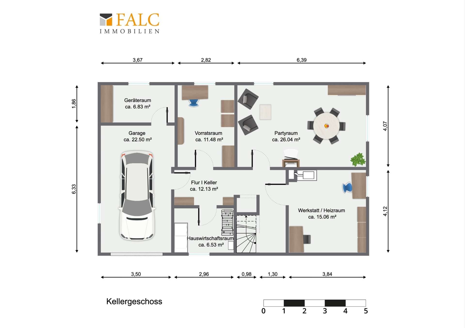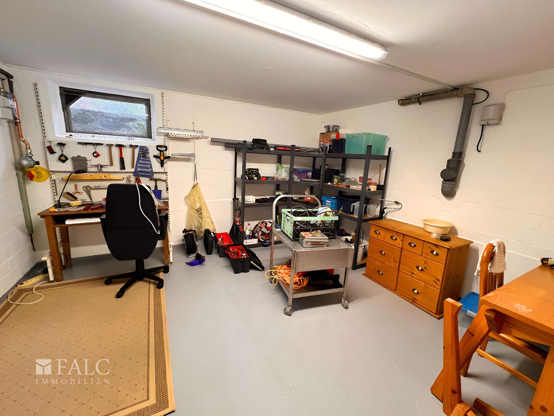 Vom Erdgeschoss aus gelangen Sie direkt in den voll ausgebauten Keller mit einer Gesamtfläche von ca. 98 qm, der neben einem großen Party- oder Hobbyraum auch einen Vorratsraum, einen Hauswirtschaftsraum, einen Abstellraum sowie einen weiteren Raum bietet, der sich optimal als Werkstatt nutzen lässt. Die integrierte Tiefgarage mit ca. 22 qm bietet Platz für ein Fahrzeug oder kann alternativ als geschützter Abstellraum für Fahrräder und Gartengeräte genutzt werden.