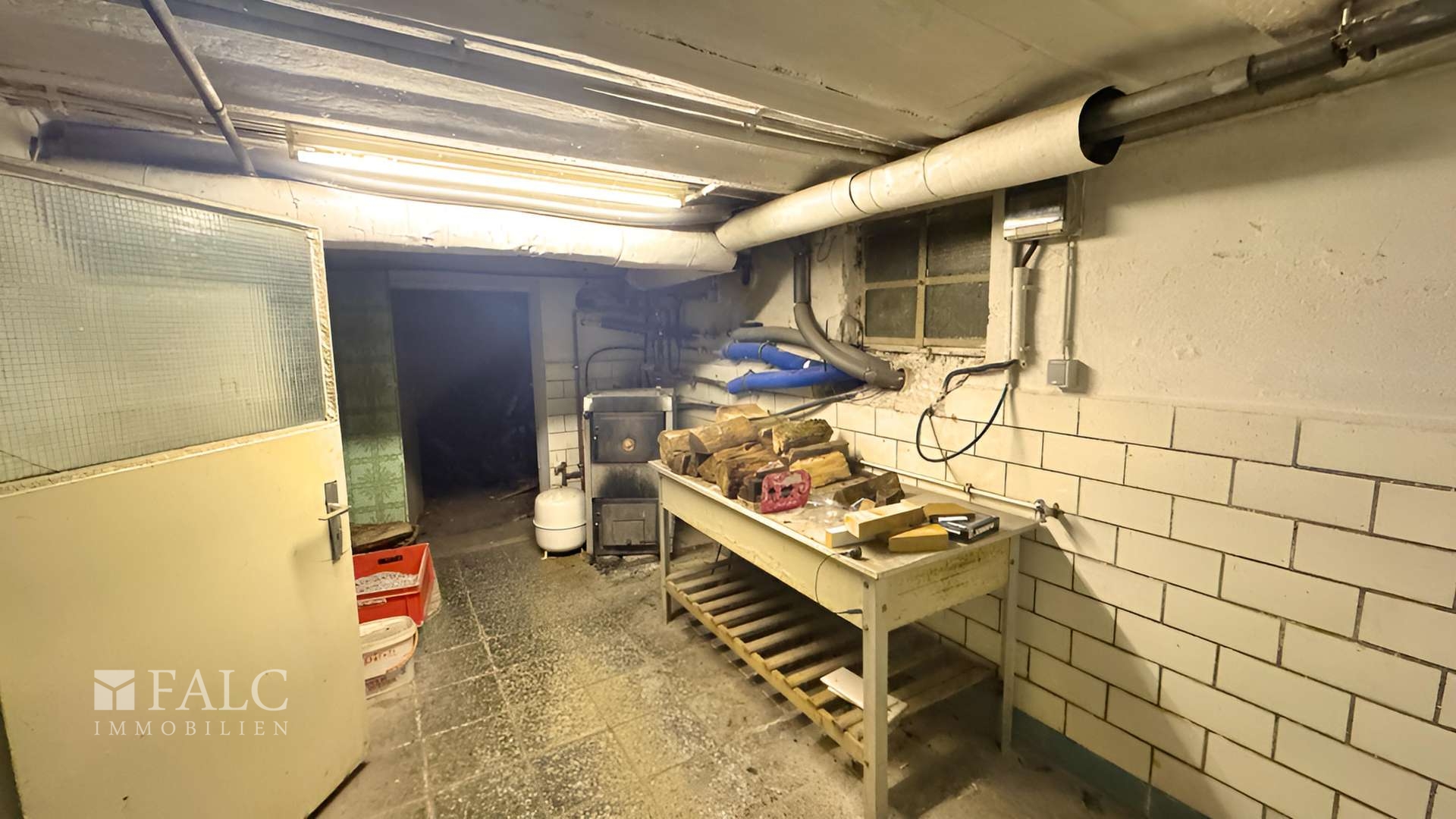 Im Keller stehen zwei Abstellräume sowie ein separates Holzlager zur Verfügung. Die Befüllung des Holzlagers kann praktisch von außen erfolgen. Zudem befinden sich hier die Öltanks und die Heizungsanlage. Neben der Öl-Heizung ist eine zusätzliche Holzheizung vorhanden, die jedoch nicht an die Warmwasserbereitung angeschlossen ist.