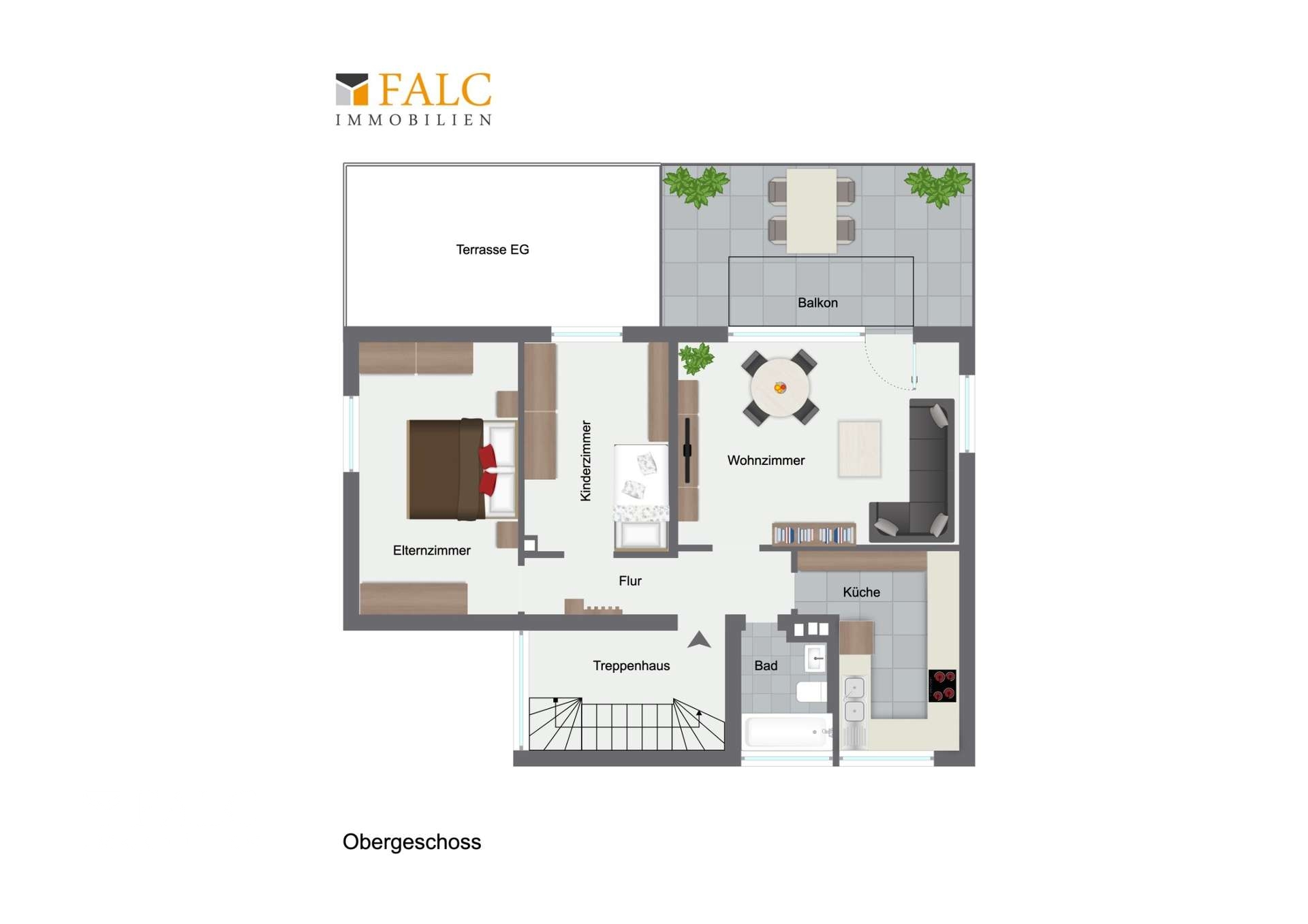 Das Obergeschoss ist seit 2009 vermietet und erzielt eine monatliche Kaltmiete von 456,75 € (inklusive 40,00 € für die Garage) zuzüglich Nebenkosten in Höhe von 81,21 €. Diese beinhalten keine Kosten für Strom, Gas oder Wasser, diese werden mit den Versorgern direkt abgerechnet. Auch hier stehen drei Zimmer mit zwei möglichen Schlafzimmern, eine Küche, ein Badezimmer sowie ein Balkon zur Verfügung. Beide Wohneinheiten teilen sich einen Kellerraum für Waschmaschinen und Trockner sowie einen weiteren Raum für Haus- und Gartennutzung.