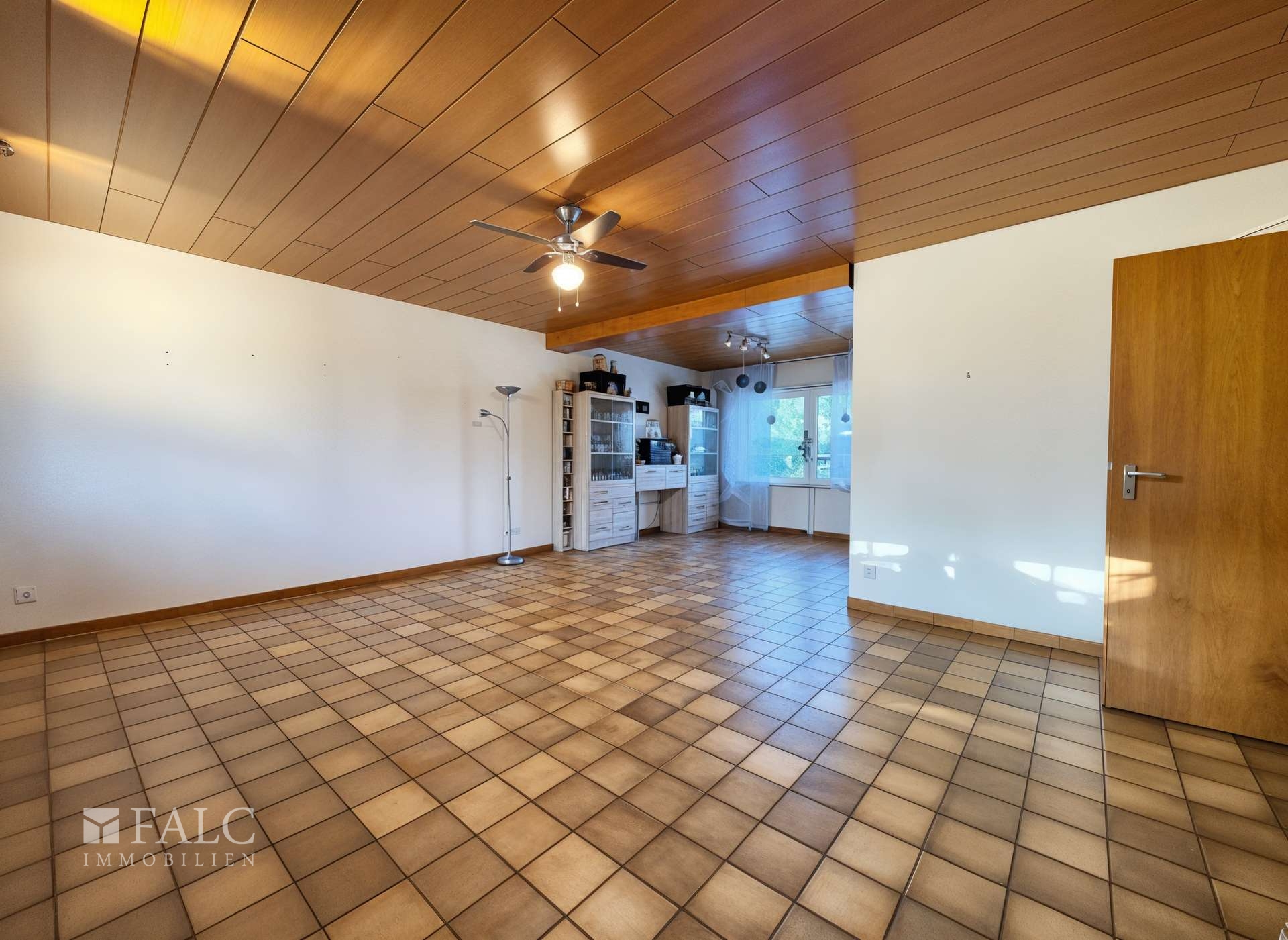Die Erdgeschosswohnung, die seit 2020 vermietet ist und seit 2025 eine Kaltmiete von 855 € erzielt, erstreckt sich über das Erdgeschoss und Teile des Kellergeschosses. Sie umfasst vier Zimmer mit bis zu drei möglichen Schlafzimmern, ein Badezimmer mit Dusche, Badewanne und Fenster, ein Gäste-WC sowie einen großzügigen Terrassenbereich mit direktem Gartenzugang. Ergänzt wird diese Einheit durch eine separate Werkstatt und einen Partyraum im Kellergeschoss.