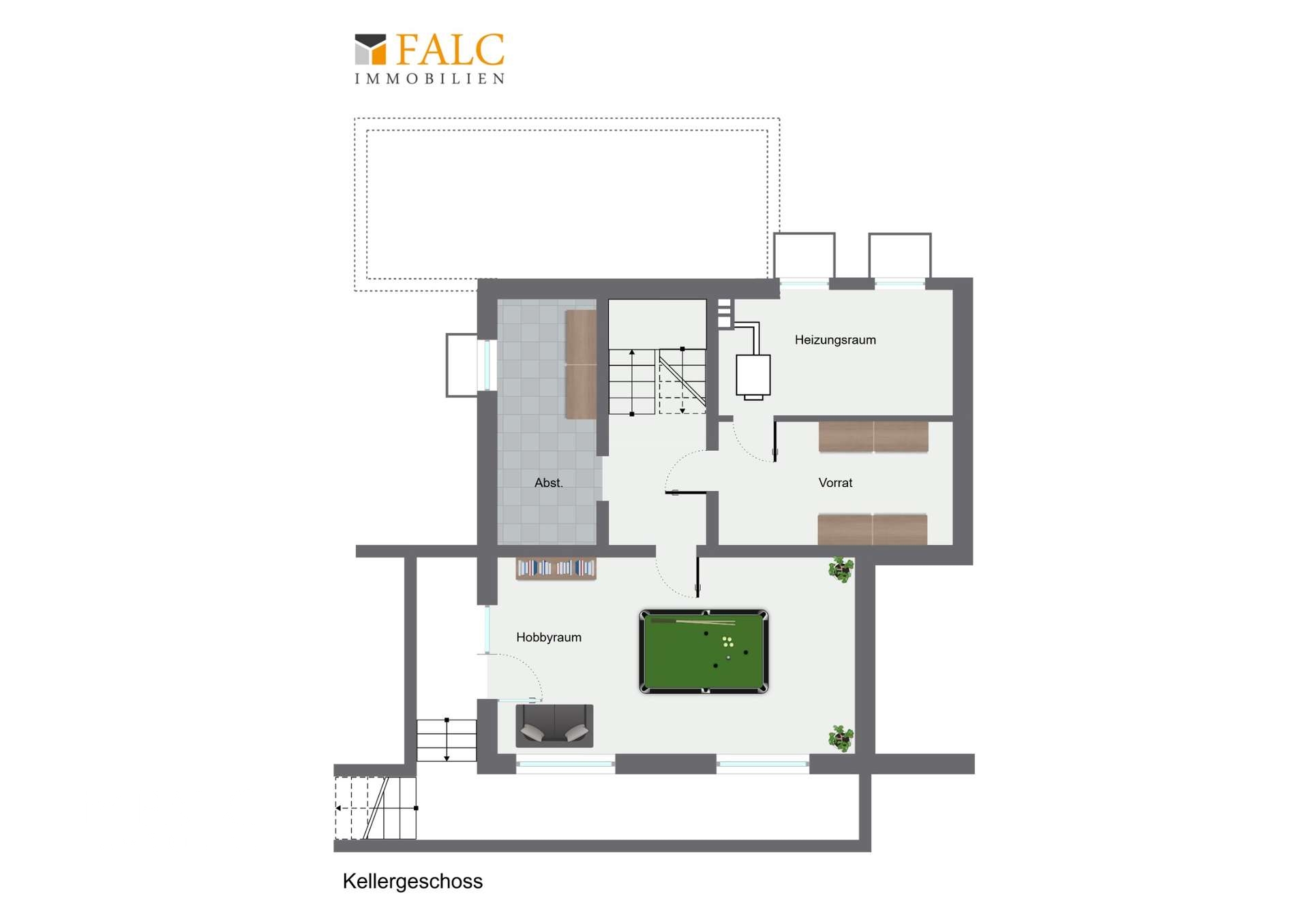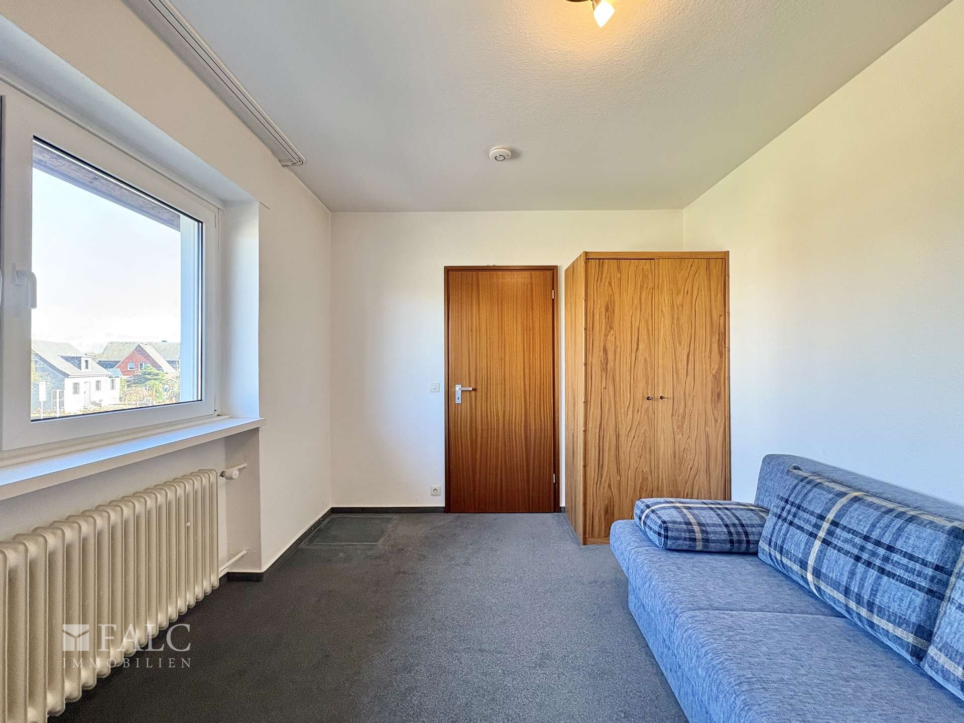 Im Obergeschoss befinden sich die privaten Räumlichkeiten sowie ein Badezimmer. Insgesamt stehen fünf Zimmer zur Verfügung, wobei – je nach Bedarf – bis zu vier Schlafzimmer realisiert werden können. Ein zusätzlich wohnlich ausgebauter Raum im Souterrain erweitert die Nutzungsmöglichkeiten und eignet sich als Schlaf-, Gäste-, Arbeits- oder Hobbyraum. Durch den separaten Eingang ergibt sich auch das Potenzial für eine Einliegerwohnung. Darüber hinaus ist das Haus vollständig unterkellert und bietet umfangreiche Abstell- und Nutzflächen.