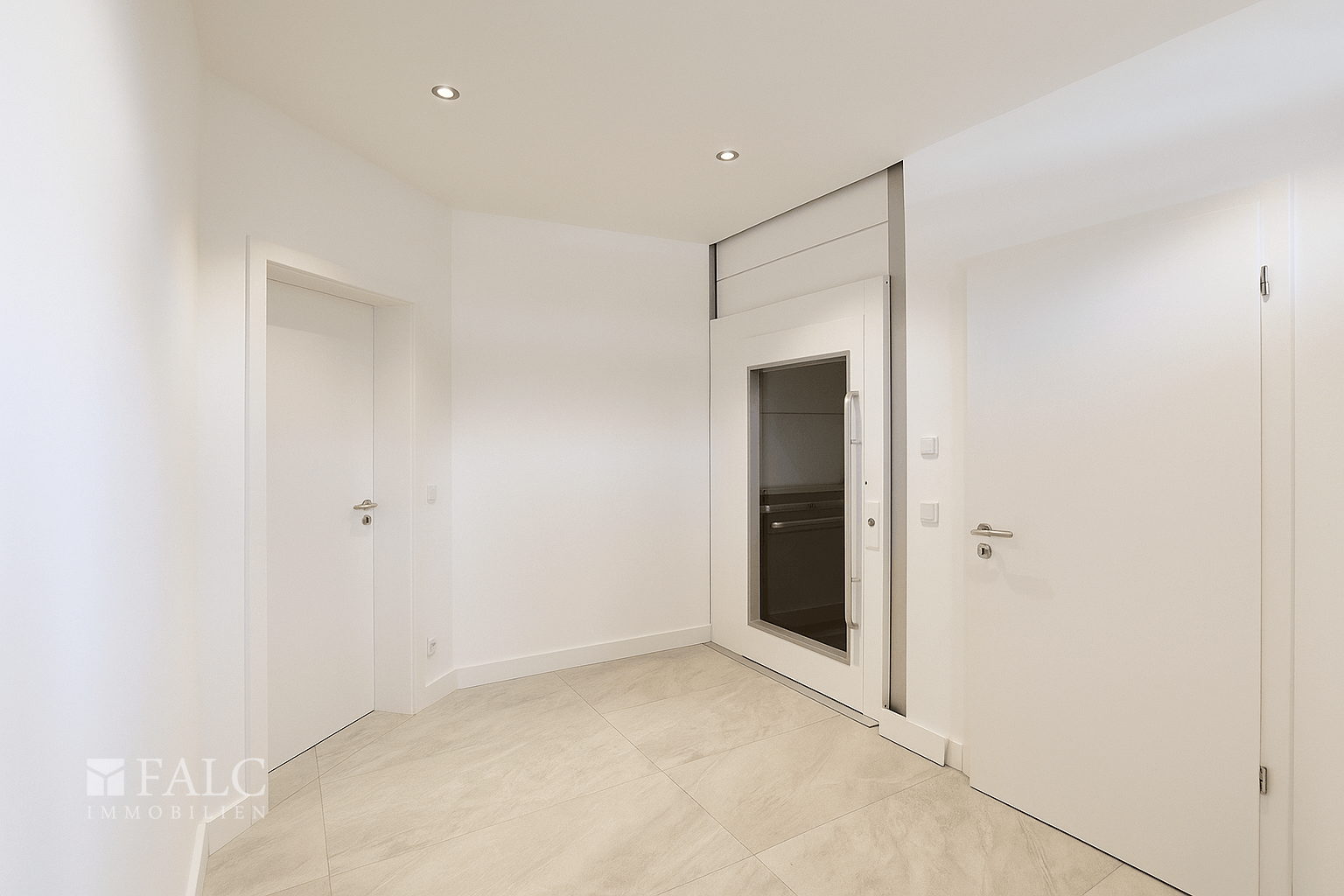 Über vier Ebenen entfaltet sich auf etwa 213 m² Wohnfläche (zzgl. ca. 40 m² Nutzfläche) ein großzügiges, durchdachtes Raumkonzept mit einer beeindruckenden Deckenhöhe von ca. 2,80 m, die in allen Wohnbereichen ein besonderes Gefühl von Weite und Eleganz schafft. Insgesamt stehen sechs Zimmer, drei luxuriöse, barrierefreie Bäder sowie ein Gäste-WC zur Verfügung. Ein Personenaufzug verbindet Unter-, Erd- und Obergeschoss und sorgt für barrierefreien Komfort bis in die Hauptebenen. Alternativ sind die Etagen über eine elegante Treppe aus Stahlbeton mit edlen Eichenholz-Trittstufen verbunden.
