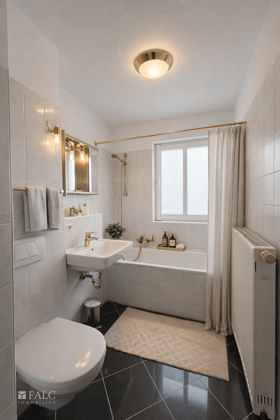 Das Badezimmer mit Fenster und Badewanne sowie die funktional gestaltete Diele runden das Raumangebot im Erdgeschoss stimmig ab.