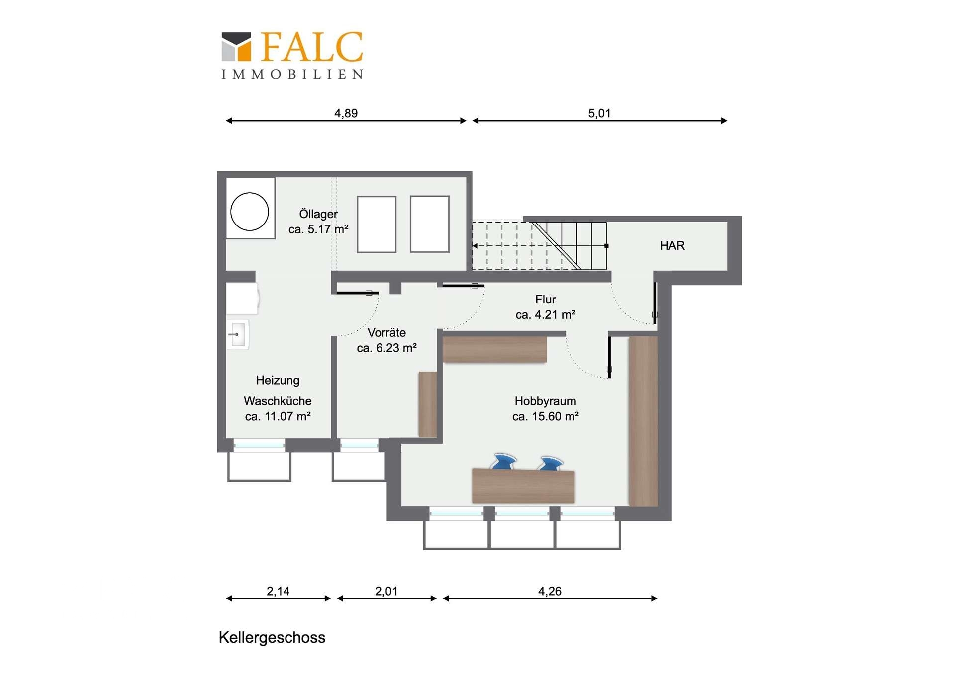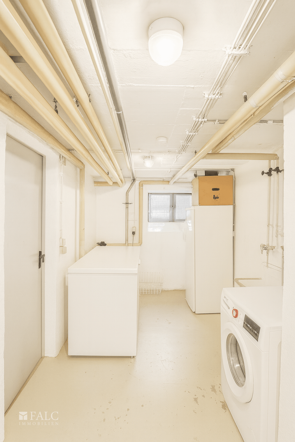 Über eine interne Treppe führt der Weg in das Kellergeschoss, das die Nutzfläche der Wohnung erheblich erweitert. Der Hobbyraum mit rund 15,6 m² lässt sich flexibel einsetzen und bietet sich insbesondere als Büro oder Gästezimmer an. Ergänzt wird diese Ebene durch Vorratsräume, eine Waschküche sowie zusätzliche Abstellflächen, die für Ordnung und praktischen Stauraum sorgen.