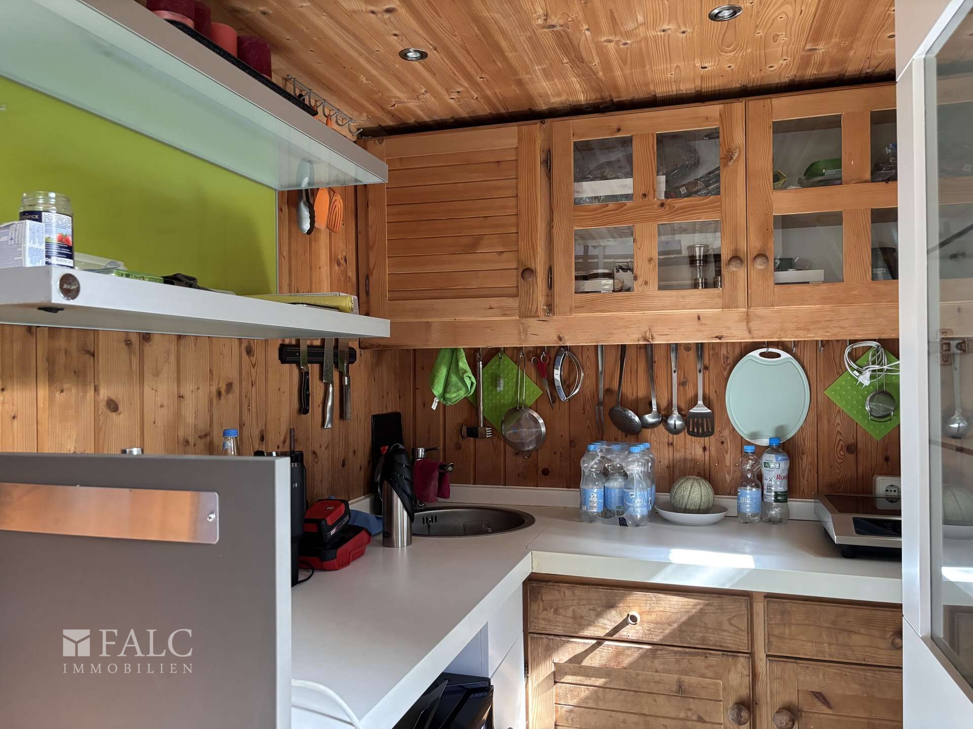 - Innenausstattung: Aufenthaltsraum mit Küchenzeile; Einbauwaschbecken mit Theke; fest integrierte Möbel