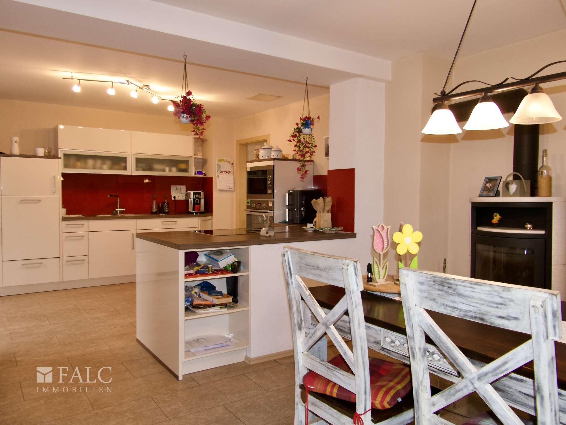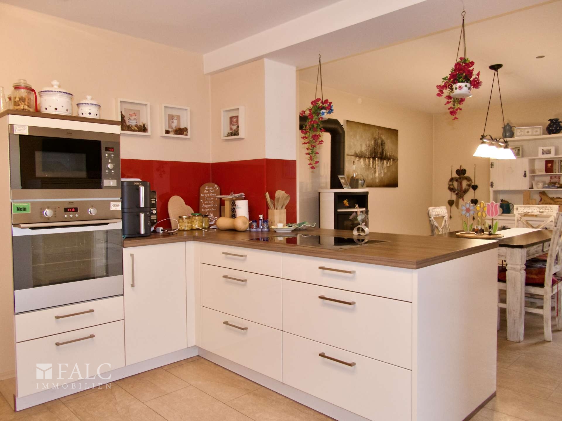 Beim Betreten des Hauses gelangen Sie in einen einladenden Eingangsbereich, der direkt in den offenen Wohn- und Essbereich führt. Hier sorgt ein Holzofen für eine gemütliche Atmosphäre. Die moderne Einbauküche ist ein Highlight für Kochbegeisterte und bietet viel Stauraum sowie hochwertige Geräte.