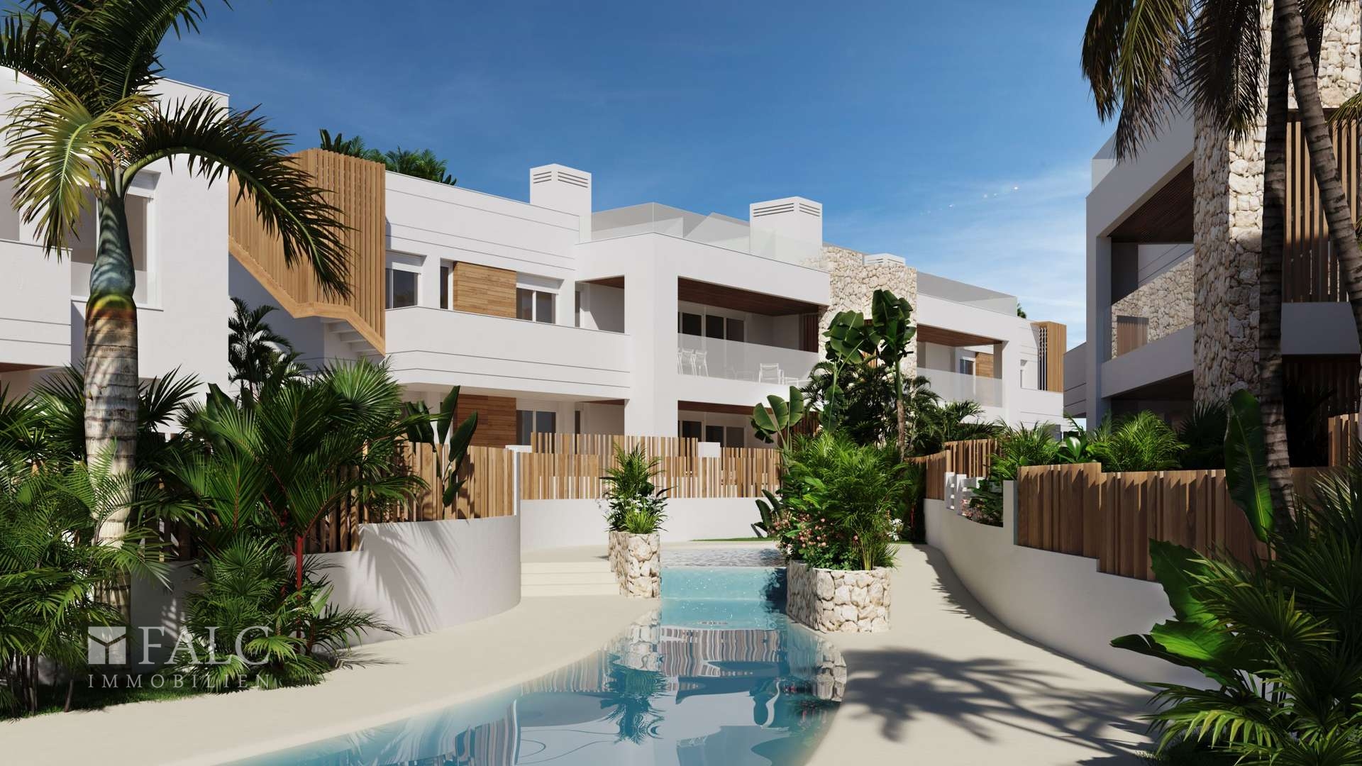 Willkommen in einem exklusiven Refugium aus nur 18 hochmodernen Villen, die Ästhetik und Funktionalität auf höchstem Niveau vereinen. Dieses Neubauprojekt besticht durch eine klare, zeitgenössische Architektur, die mit einer Kombination aus strahlend weißem Putz, edlen Steinelementen und warmen Porzellan-Details in Holzoptik überzeugt.