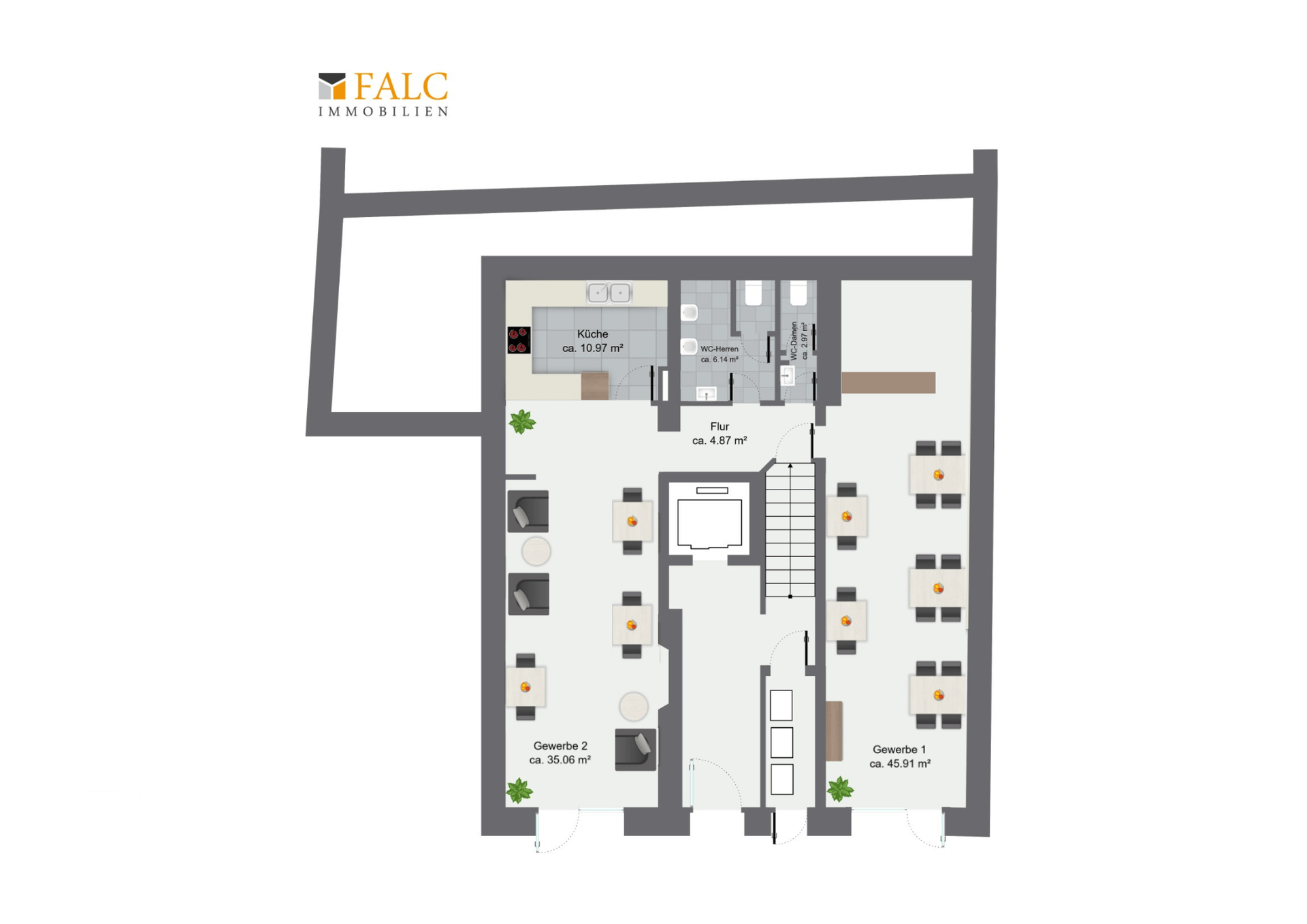 Die Immobilie umfasst zwei miteinander verbundene Einheiten, die über einen zentralen Flur erschlossen werden. Die erste Einheit bietet mit ca. 46 m² einen großzügigen Gäste- oder Verkaufsraum, der durch seine offene Gestaltung vielseitige Nutzungsmöglichkeiten eröffnet. Die zweite Einheit verfügt über ca. 35 m² und beherbergt sowohl die Küche als auch einen weiteren Gästeraum.