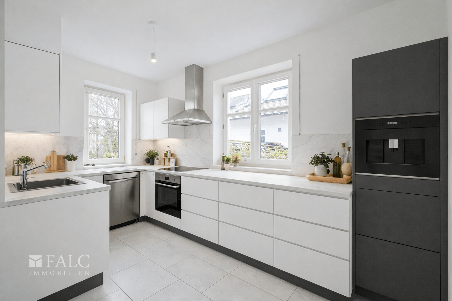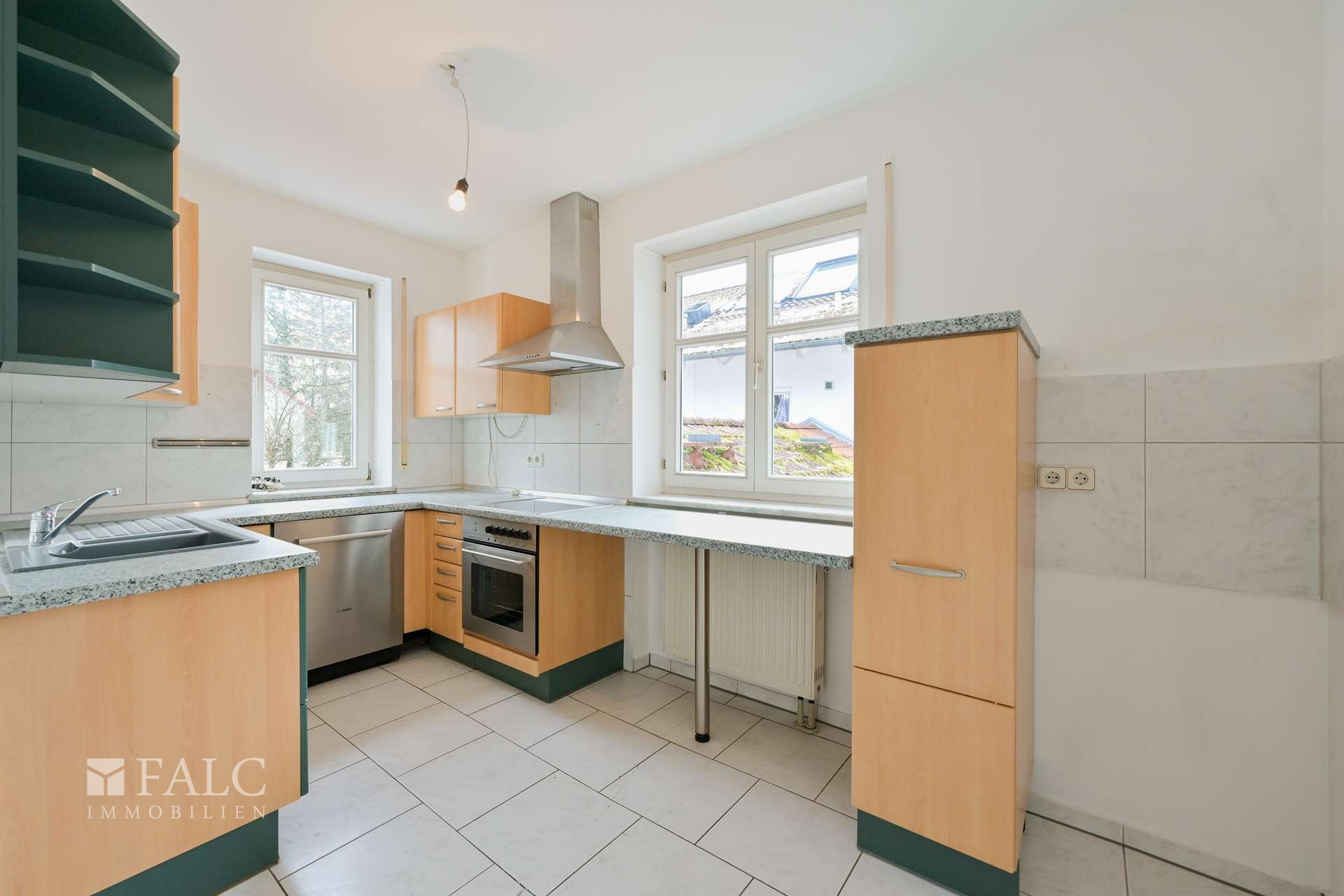 Die Küche ist separat angeordnet und bietet ausreichend Platz für eine individuelle Gestaltung. Sie eignet sich sowohl für einen klassischen Kochbereich als auch für eine Kombination aus Kochen und kleinem Essplatz.