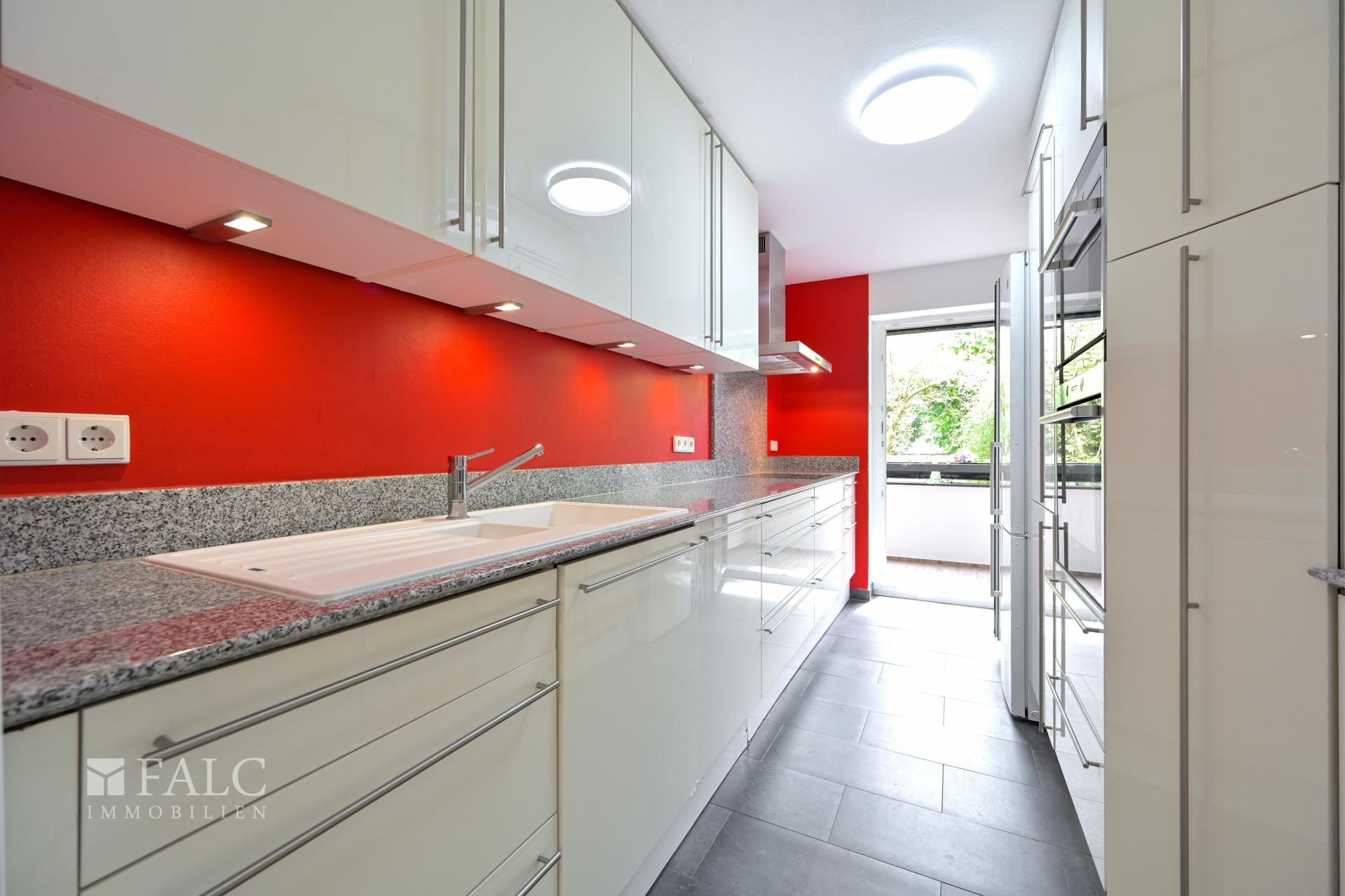 Die moderne Einbauküche mit edler Granit-Arbeitsplatte, stimmiger Beleuchtung und allen nötigen Geräten ausgestattet. Dank bodentiefer Fenster haben Sie direkten Zugang zum Südost-Balkon – perfekt für ein sonniges Frühstück.