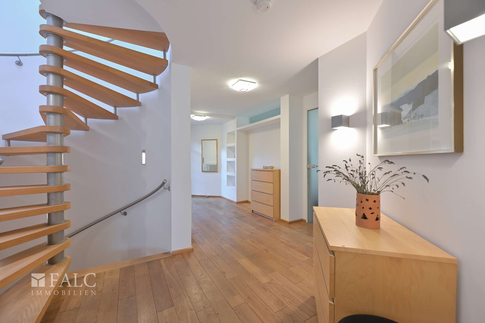 Die Architektur verbindet klassische Stilelemente mit modernen Details und schafft ein behagliches, zugleich exklusives Wohnambiente. Sichtbare Holzbalken und edles Echtholzparkett verleihen den Räumen Wärme und stilvolle Eleganz. Der von Tageslicht durchflutete Eingangsbereich bietet ausreichend Platz für Ihre Garderobe.