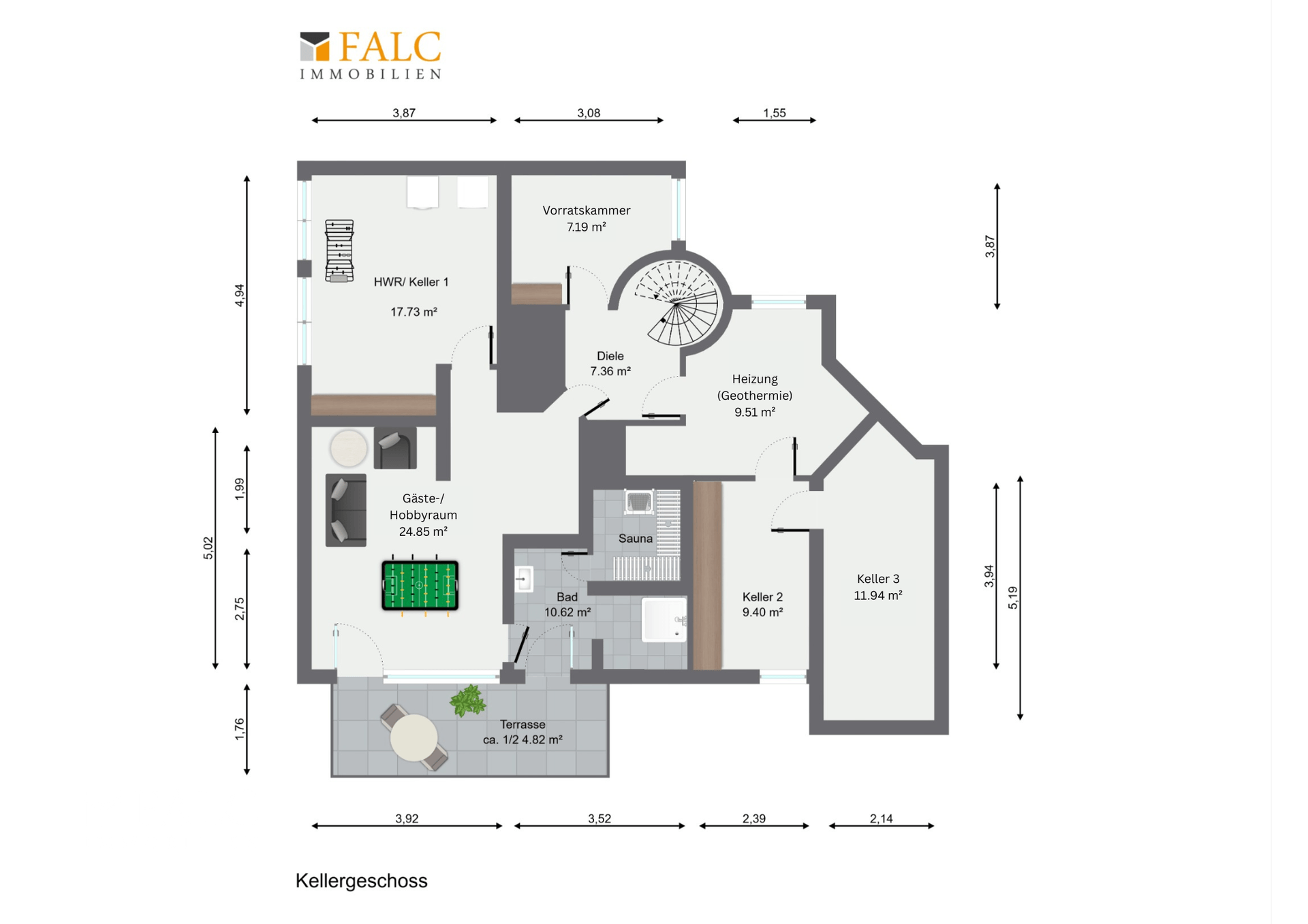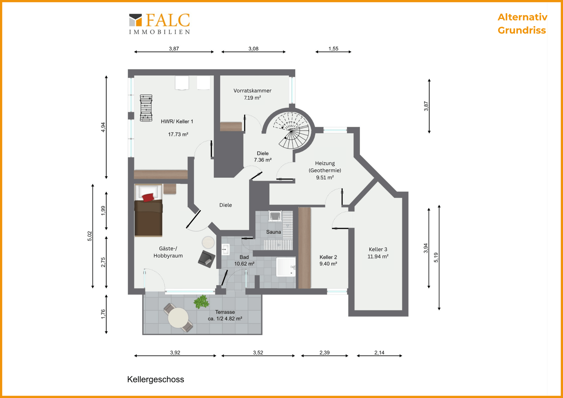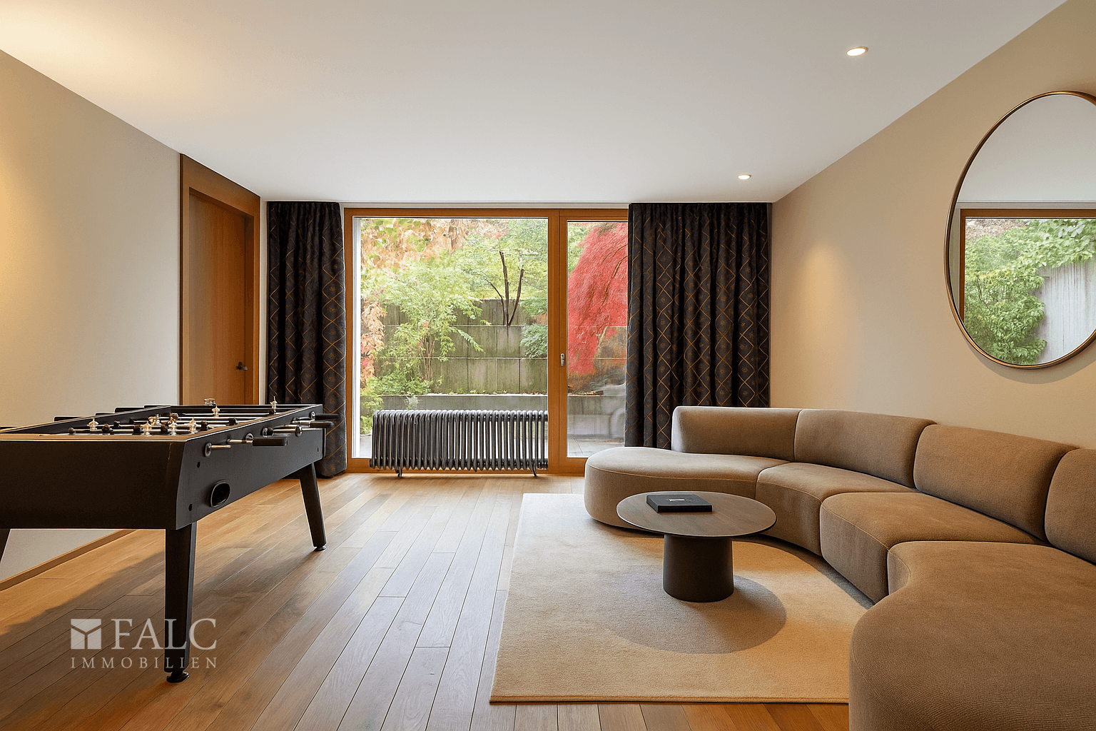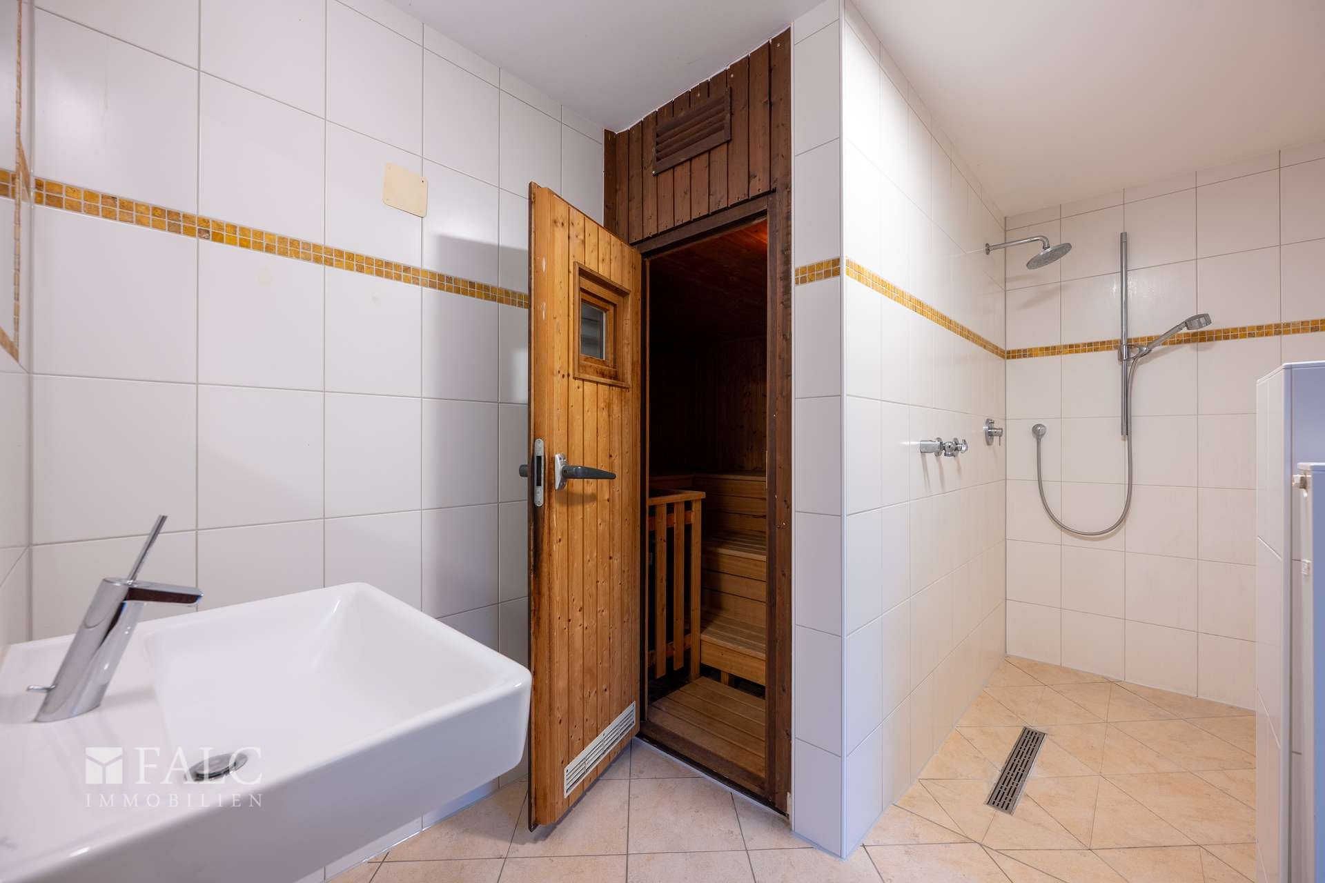 Das Untergeschoss ist sowohl über die Wendeltreppe als auch über die Souterrain-Terrasse zugänglich und bietet vielseitige Nutzungsmöglichkeiten. Neben zwei Kellerräumen, dem Heizungsraum (Geothermie) sowie Hauswirtschafts- und Vorratsräumen steht ein rund 25 m² großes Zimmer zur Verfügung, das sich ideal als Hobby-, Gäste- oder Fitnessbereich eignet und direkten Zugang zur Souterrain-Terrasse, die über einen Anschluss für eine Outdoor-Dusche verfügt. Ein privater Wellnessbereich mit Sauna und großer bodenebene Dusche sorgt für Erholung und Entspannung und rundet das exklusive Wohnkonzept harmonisch ab.
