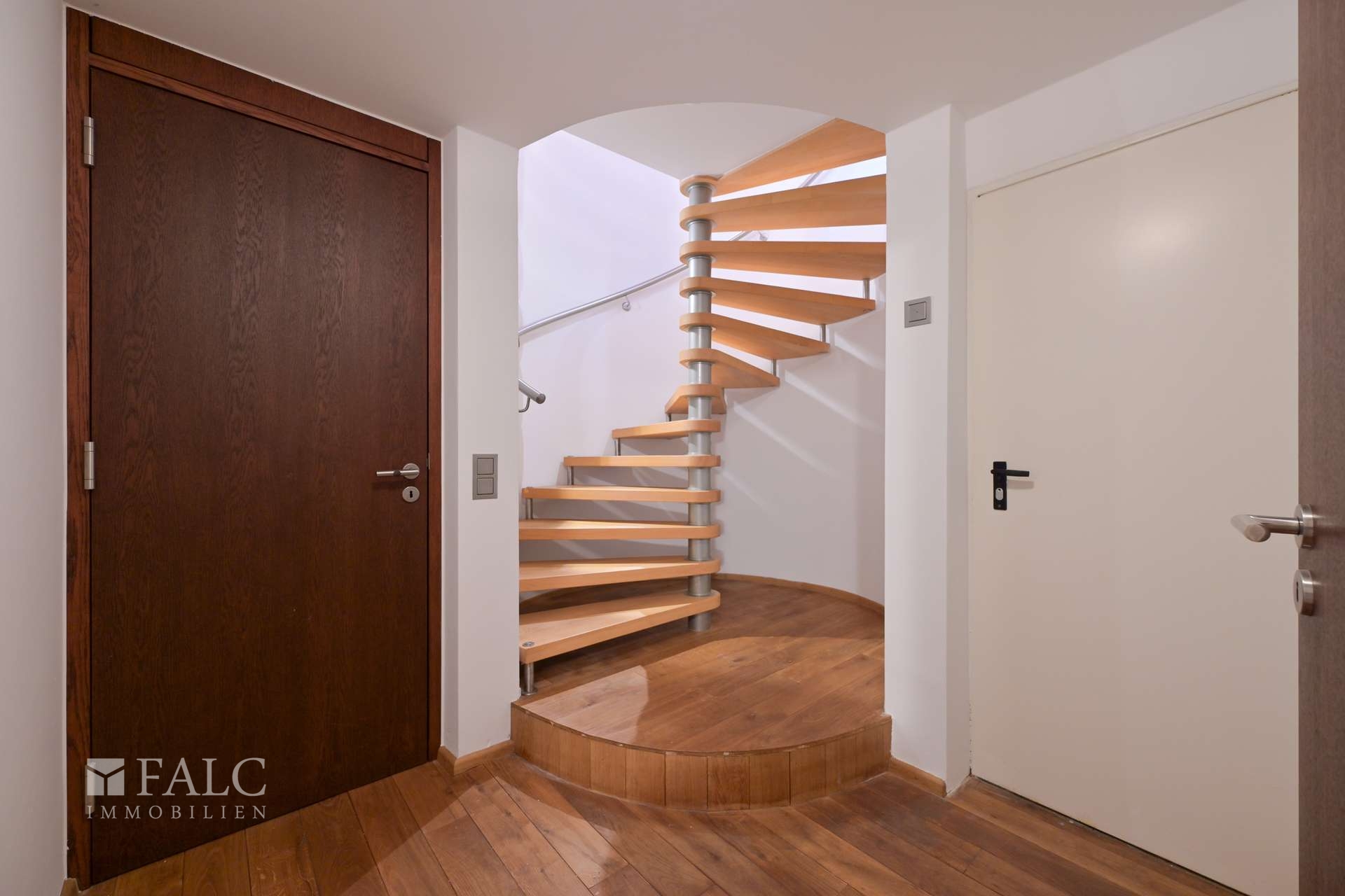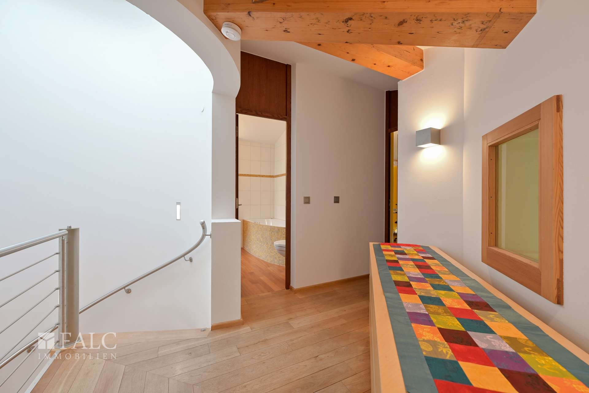 Über die Wendeltreppe gelangen Sie in die Diele des Obergeschosses, wo sich die außergewöhnliche Architektur des Hauses fortsetzt. Ein kleines Innenfenster eröffnet den Blick in den Wohnbereich, während der Lichtdom für zusätzliches Tageslicht sorgt.