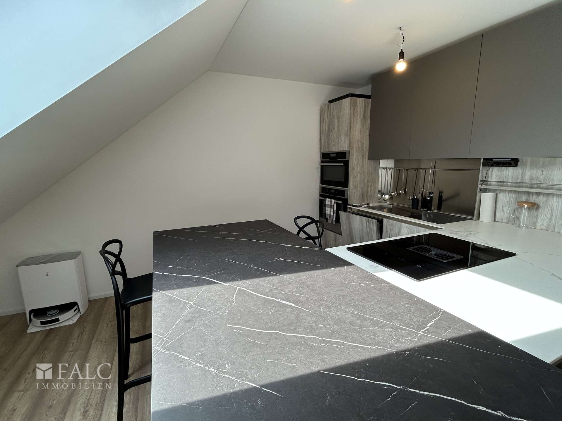 Das Herzstück der Wohnung bildet der offene Wohn- und Essbereich mit integrierter Küche. Die moderne Einbauküche, die gegen Ablöse übernommen werden kann, überzeugt durch hochwertige Materialien, elegante Arbeitsflächen und moderne Elektrogeräte, die sowohl optisch als auch funktional überzeugen. Der Mix aus Laminat- und Fliesenboden verleiht den Räumen eine zeitlose Eleganz und ist zugleich pflegeleicht.