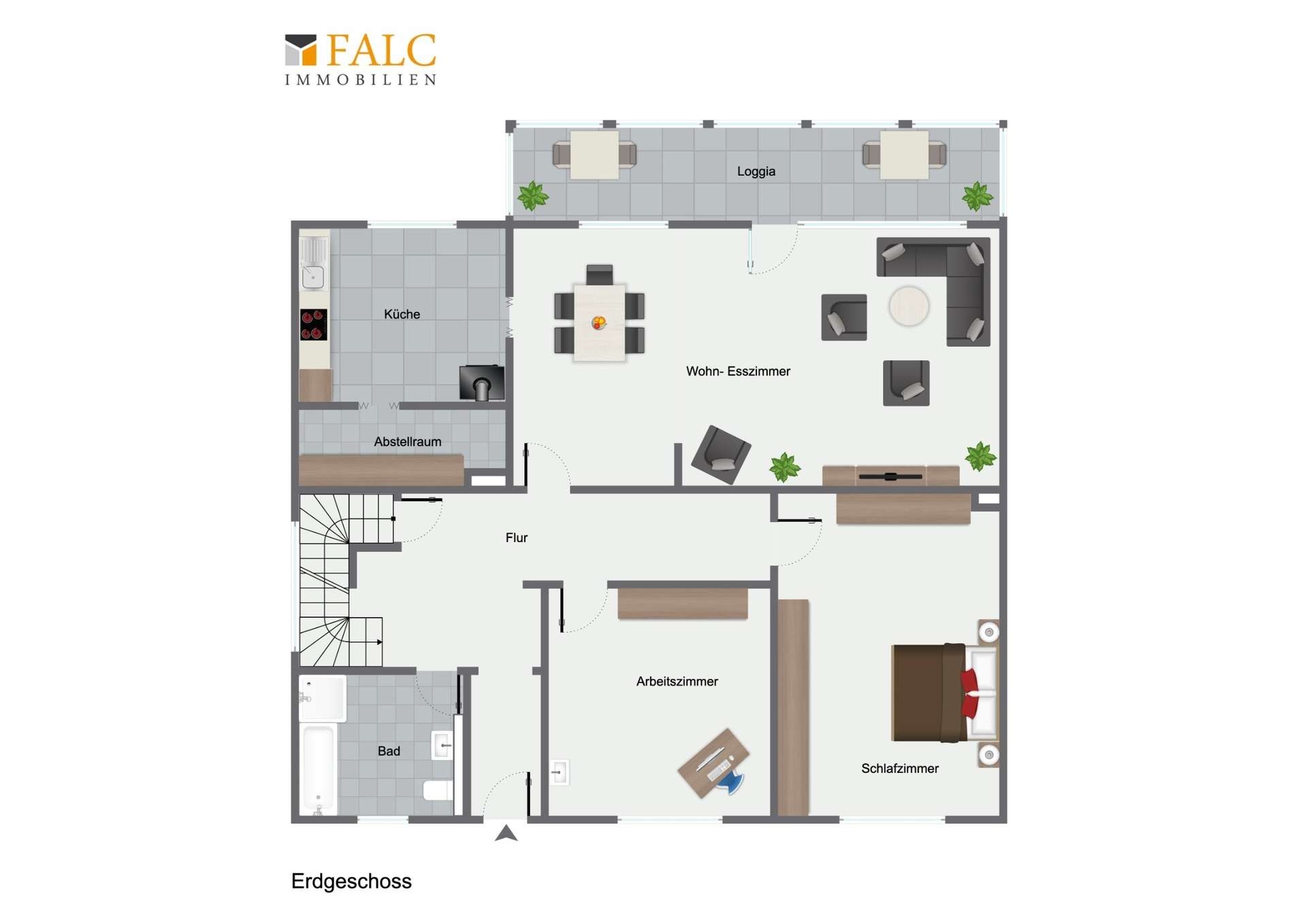 Im Erdgeschoss befinden sich ein geräumiges offenes Wohn- und Esszimmer, eine Küche mit angrenzendem Abstellraum, ein Arbeitszimmer, ein Schlafzimmer, ein Bad sowie ein geräumiger Flur.