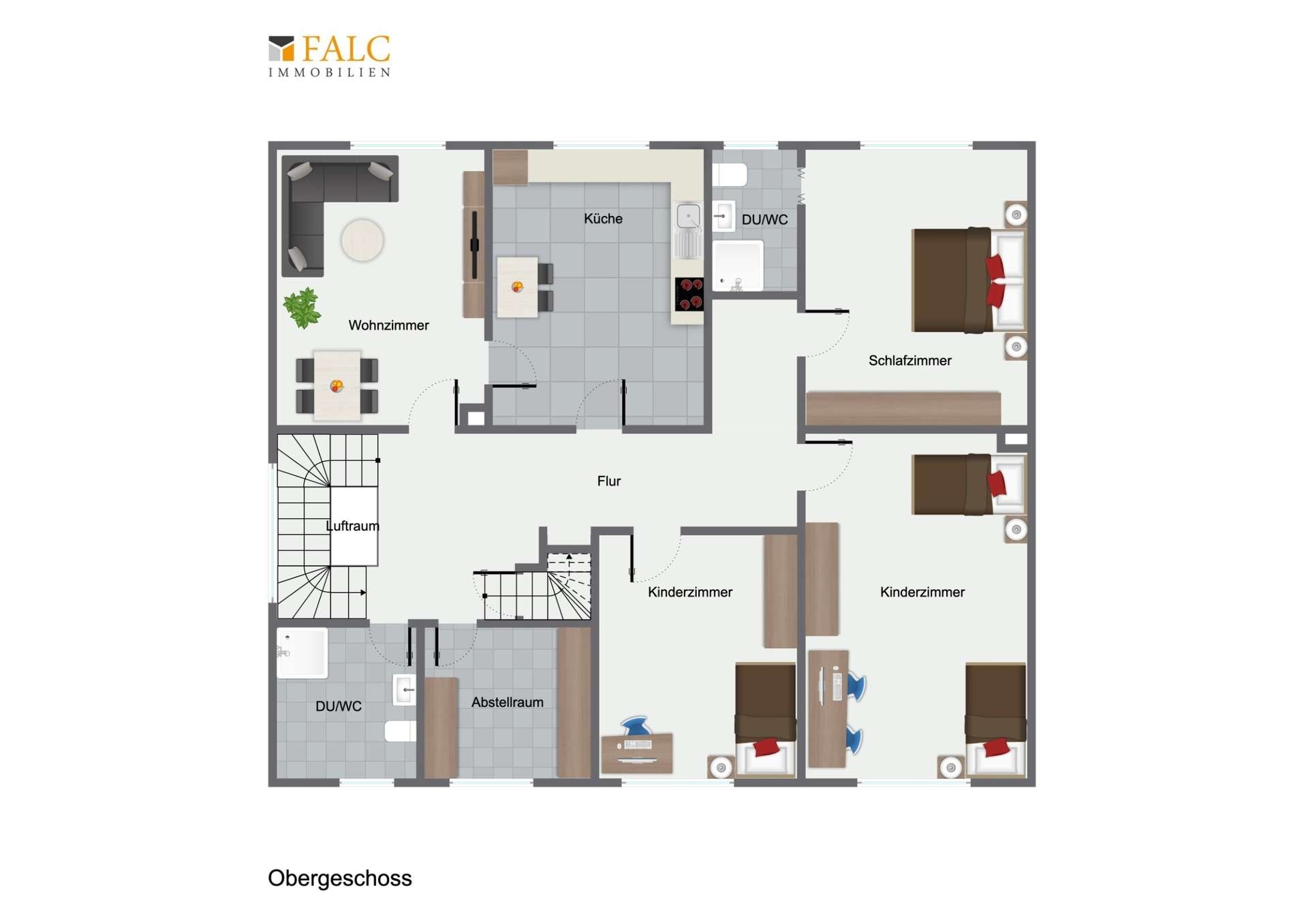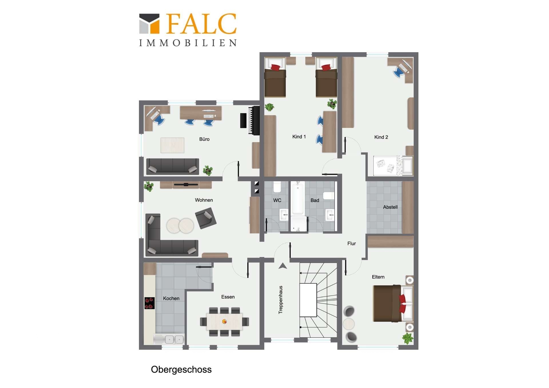 Im Obergeschoss sind drei Schlafzimmer eins davon mit Dusche und WC, ein Wohnzimmer, eine Küche, ein Abstellraum und nochmal eine Dusche mit WC.