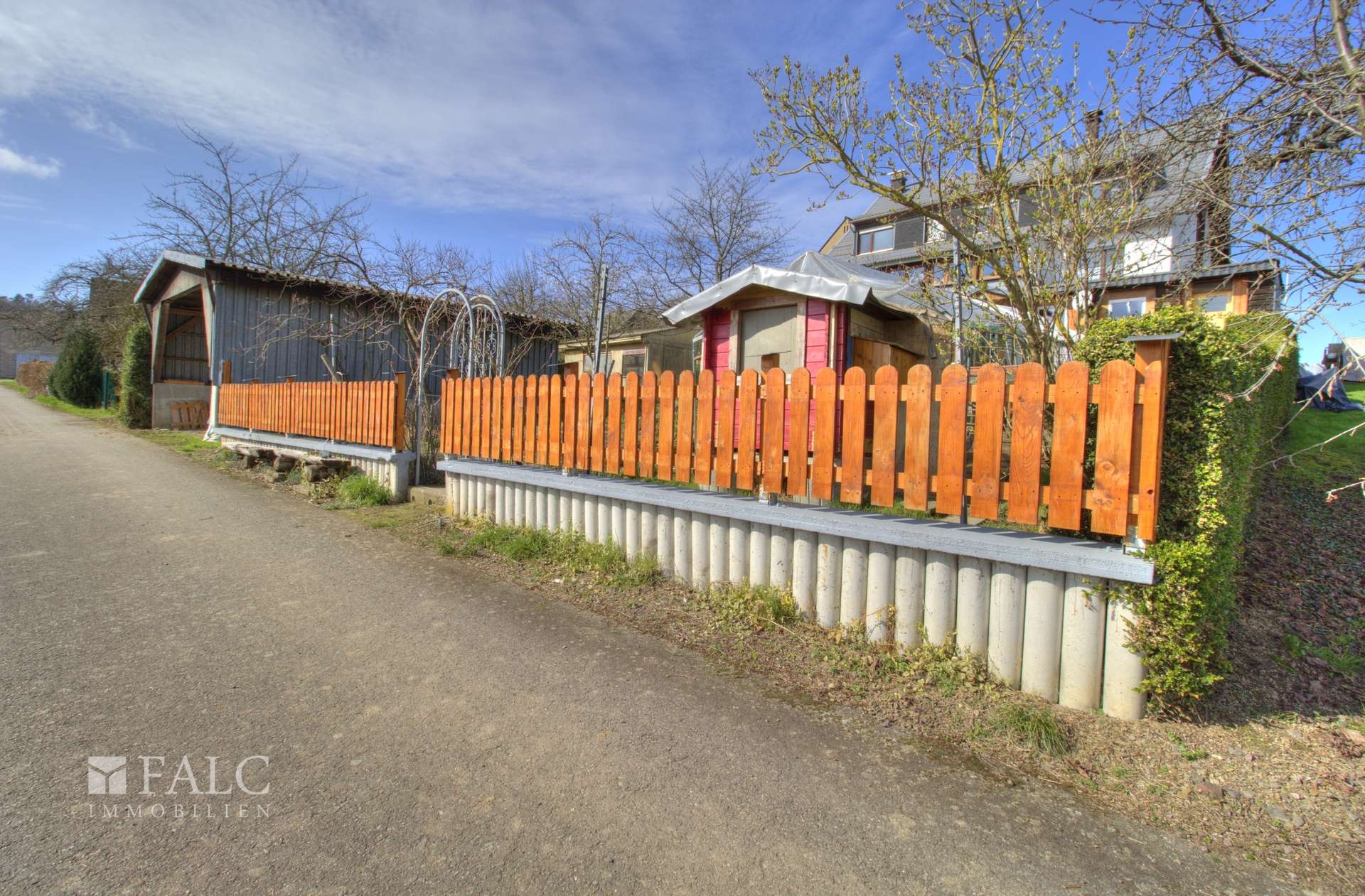 Von hier aus hat man auch Zugang zum großen Garten. Dort gibt es eine Terrasse und ein Gartenhaus und eine große überdachte Stellfläche.