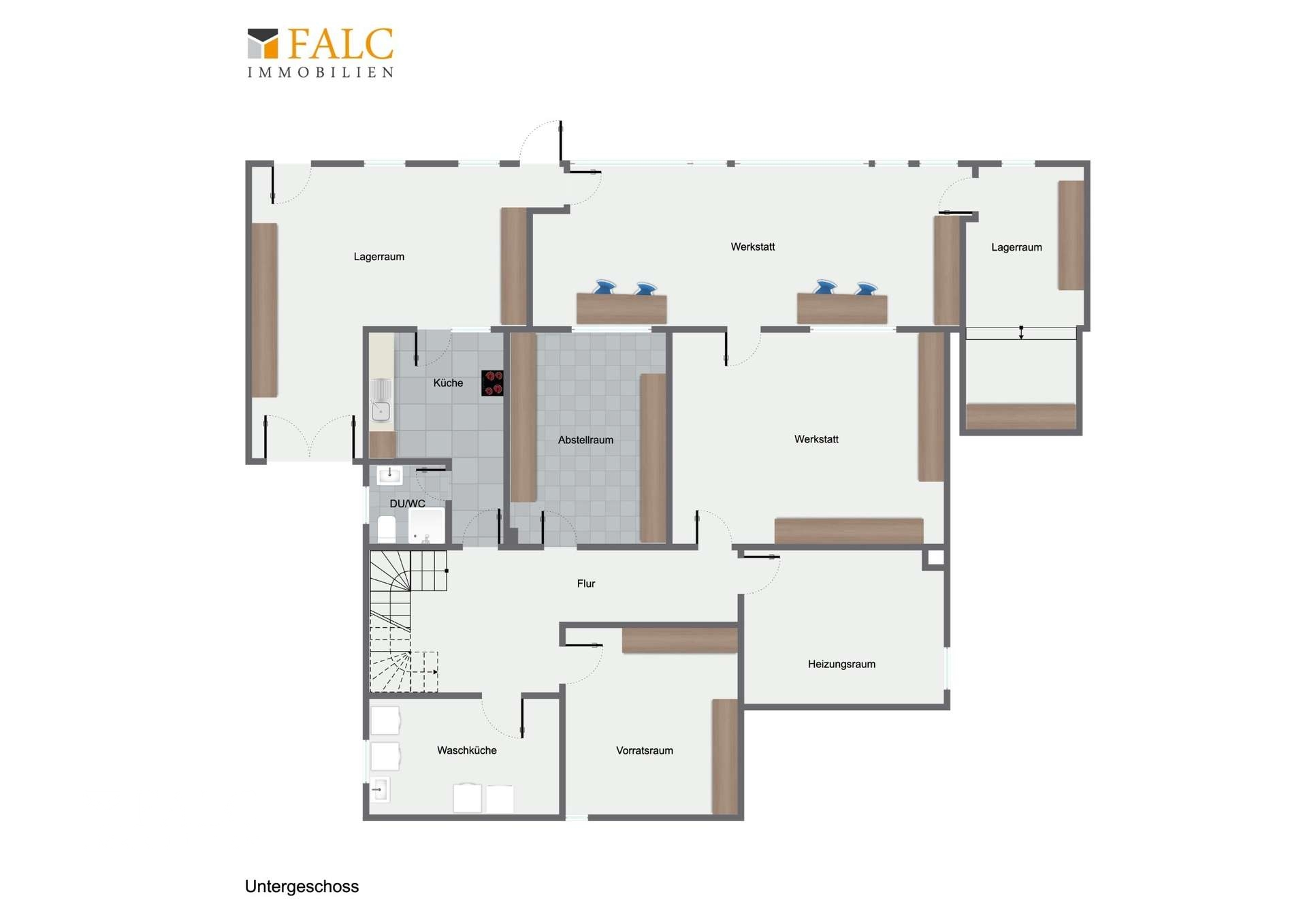 Im Keller gibt es neben dem Heizungsraum, einer Waschküche, einer kleinen Küche und einem WC mit Dusche sechs weitere Räume. Diese wurden in der Vergangenheit überwiegend als Werkstatt benutz. Sie sind zum Teil mit großen Fenstern ausgestattet und sind somit der ideale Arbeitsplatz für den Handwerker, außerdem bieten sie viel Platz und Abstellmöglichkeiten.