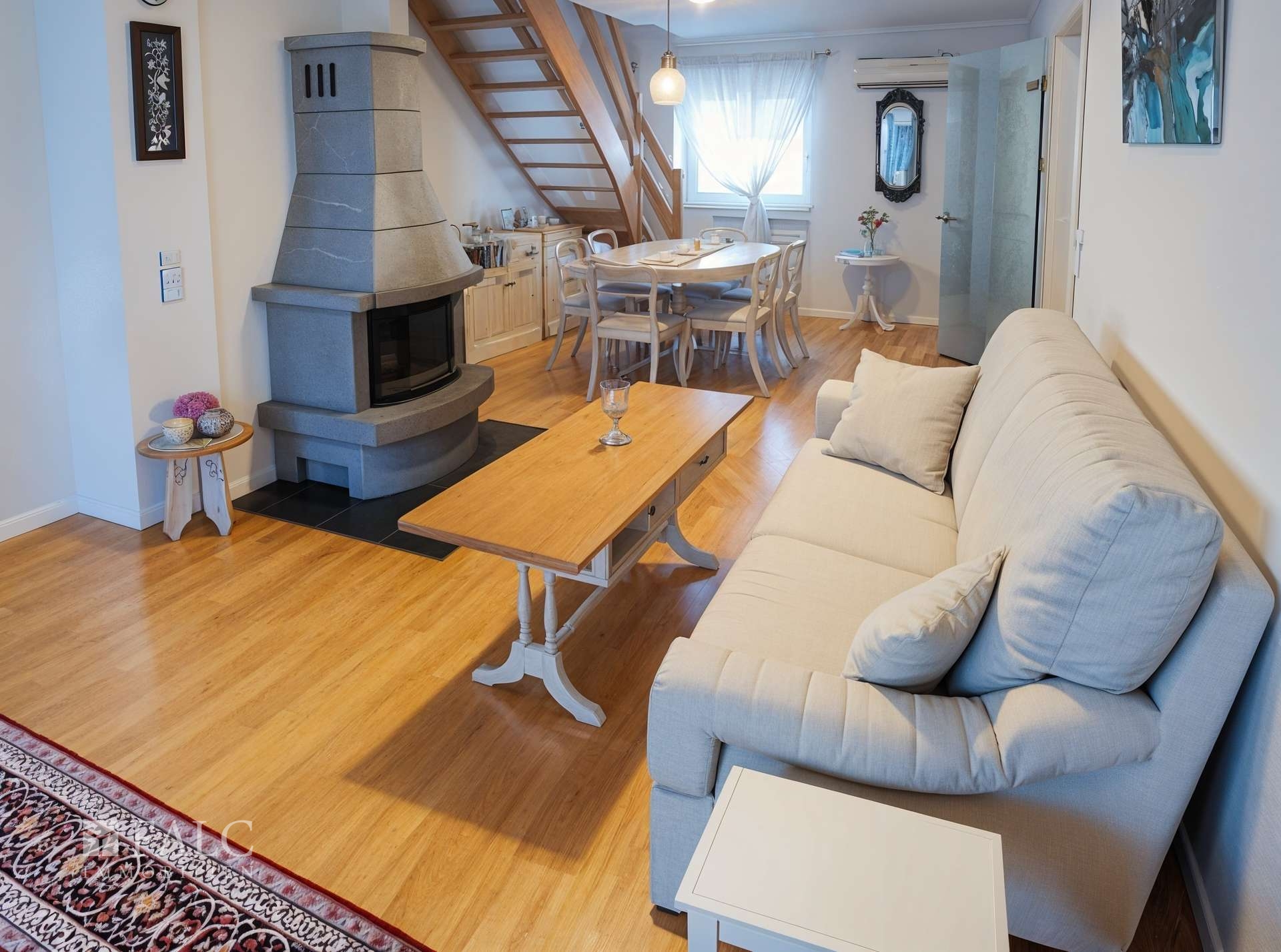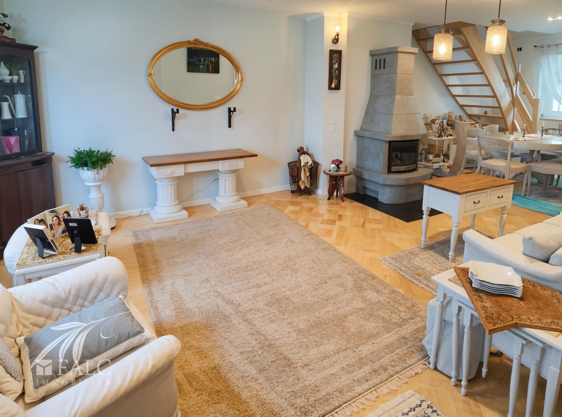 Hochwertige Materialien, wie neue Innentüren, eine elegante Holztreppe und ein stilvoll gestalteter Kamin im Wohnzimmer, verleihen dem Haus eine behagliche und zugleich edle Atmosphäre. Das Badezimmer im Erdgeschoss wurde 2019 modernisiert, während das Dach von 2012 langfristige Sicherheit und eine solide energetische Basis bietet.