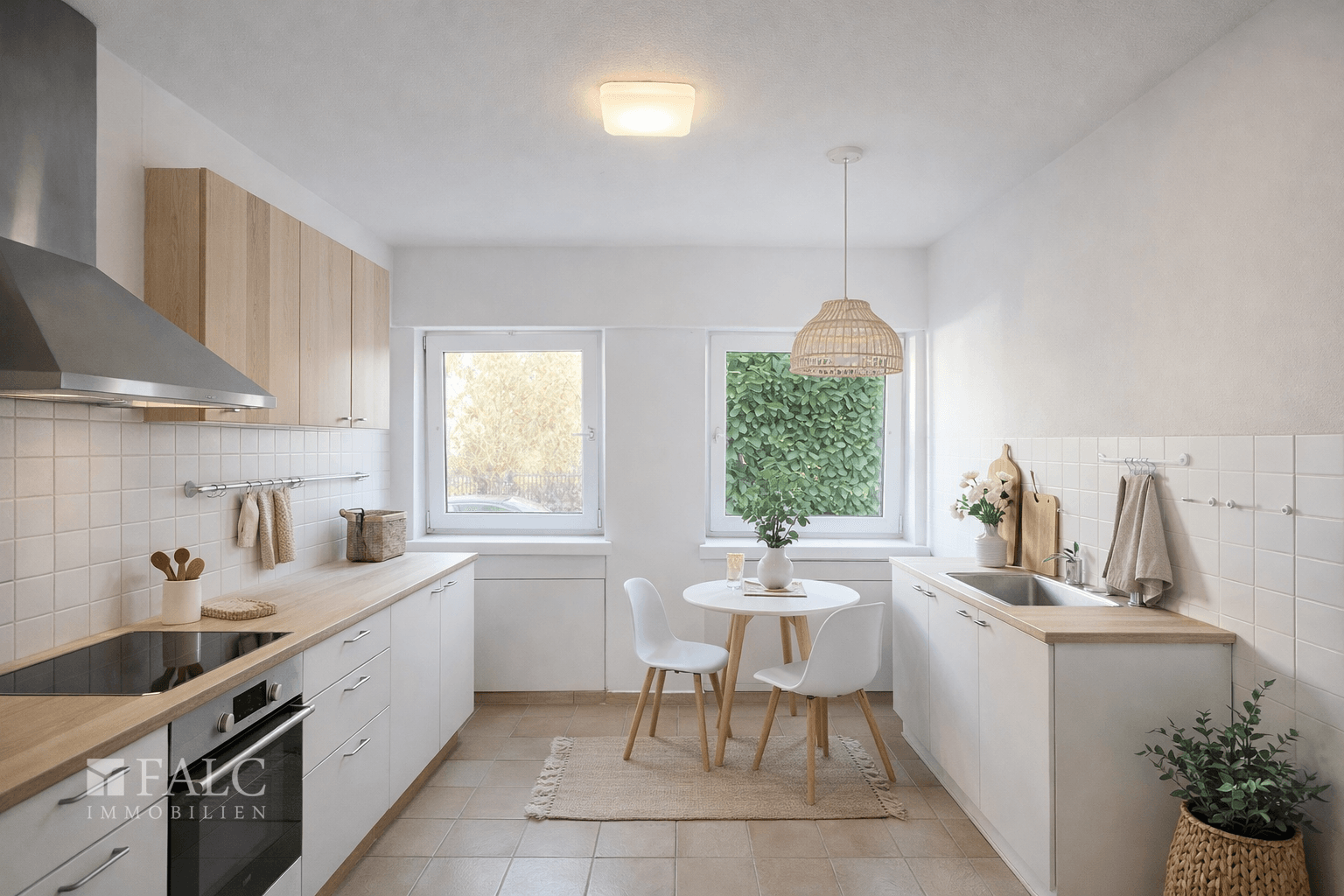 Eine separate Küche sowie ein praktischer Flurbereich runden den funktionalen Grundriss ab. Beheizt wird die Wohnung über eine Öl-Zentralheizung, die ebenfalls die Warmwasserversorgung übernimmt.