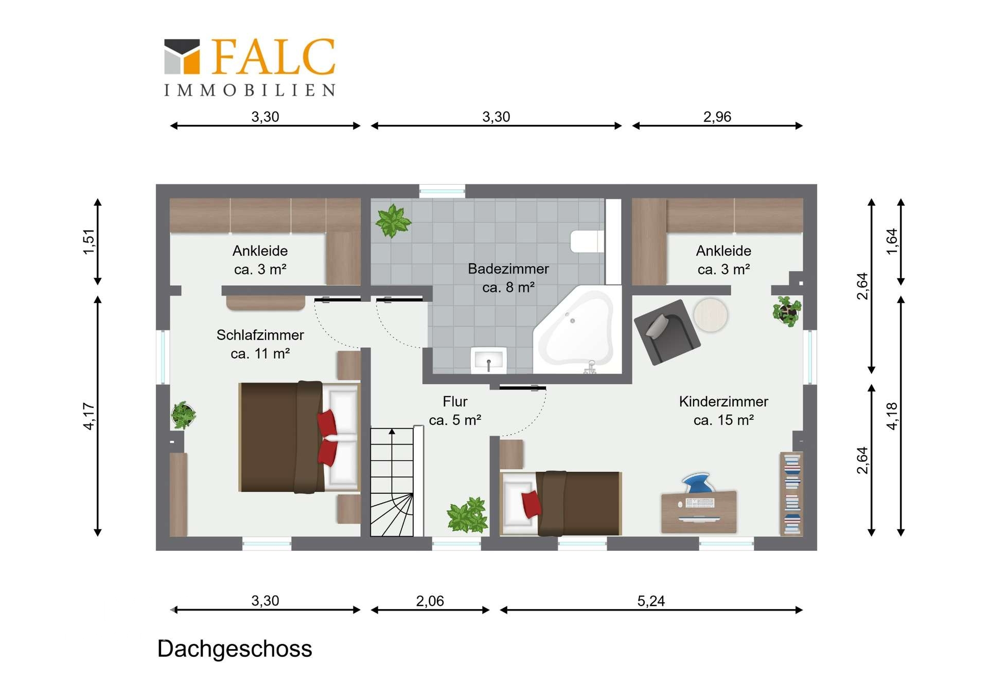 Im Dachgeschoss stehen Ihnen zwei stilvolle Schlafzimmer zur Verfügung, die durch ihre offenliegenden Deckenbalken eine besonders gemütliche Atmosphäre schaffen. Praktische Ankleiden runden diese Bereiche ab. Das zweite Badezimmer ist ebenfalls hochwertig ausgestattet und verfügt über eine Badewanne.