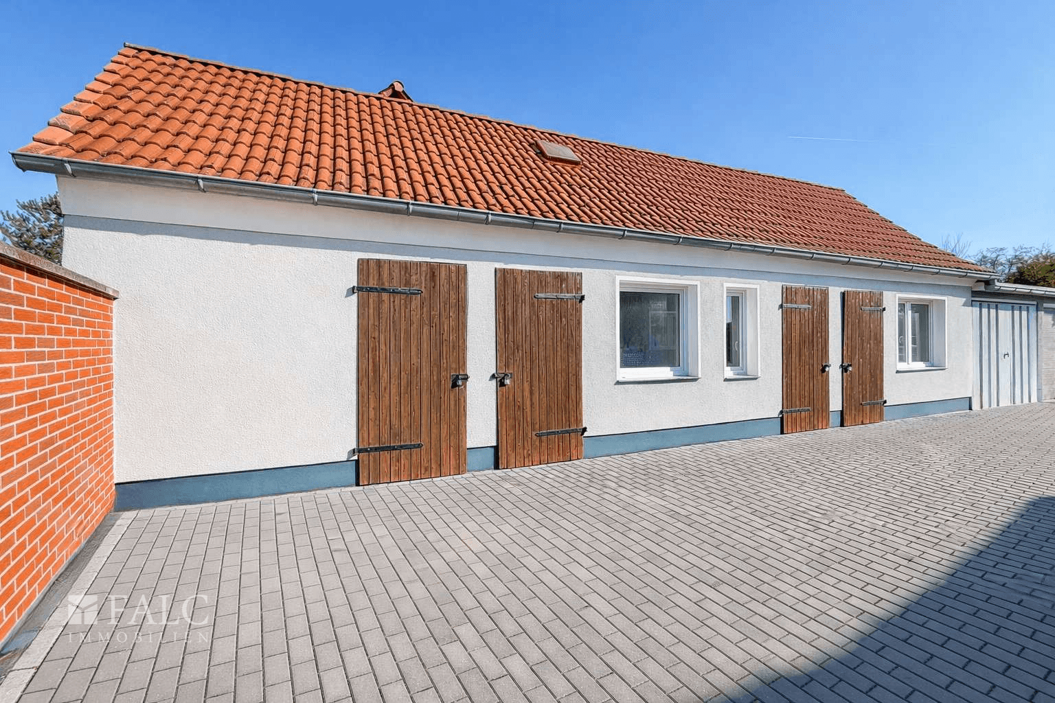 Das ca. 840 m² große Grundstück bietet vielfältige Nutzungsmöglichkeiten. Neben zwei eigenen Stellplätzen direkt vor dem Haus steht Ihnen gegenüber ein großzügiges Nebengebäude mit ca. 63 m² zur Verfügung, welches mehrere Räume sowie eine Garage umfasst. Zusätzlich profitieren Sie von einem weiteren kleinen Nebengebäude sowie einer praktischen Überdachung. Für eine kostensparende Gartenbewässerung ist ein eigener Brunnen vorhanden. Das gesamte Grundstück ist eingefriedet und verfügt über ein elektrisch betriebenes Hoftor, was Komfort und Sicherheit gleichermaßen erhöht.