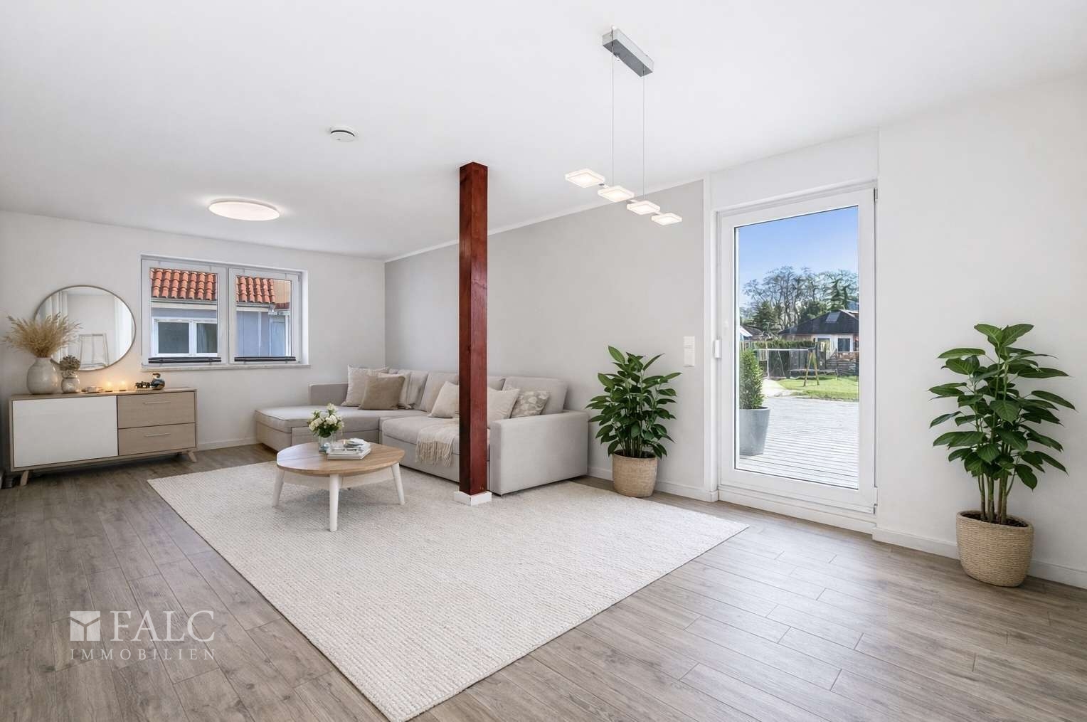 Auf ca. 118 m² Wohnfläche verteilen sich insgesamt vier Zimmer auf zwei Etagen. Das Erdgeschoss bildet das Herzstück des Hauses: Hier erwartet Sie ein lichtdurchflutetes, nach Süden ausgerichtetes Wohnzimmer. Direkt angrenzend befindet sich die großzügige Sonnenterrasse mit ca. 39 m², die den Wohnraum nach außen erweitert und vielfältige Nutzungsmöglichkeiten bietet. Ob entspannte Stunden im Freien, gesellige Abende oder Familienaktivitäten – hier entsteht ein zusätzlicher Lebensraum mit hohem Freizeitwert.