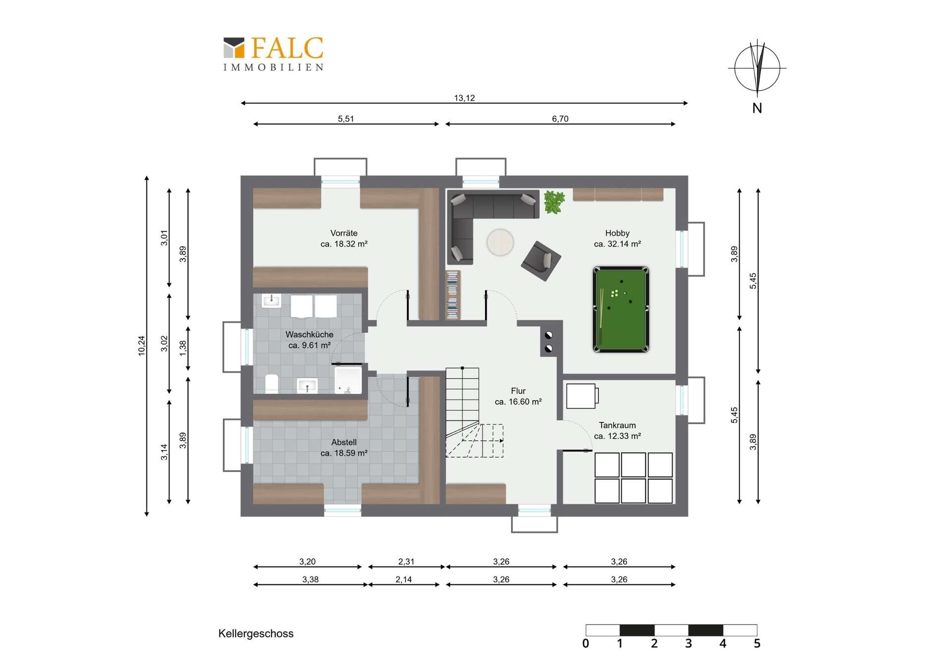 - Vollständig gefliester Keller mit wohnlich ausgebauten und beheizten Bereichen