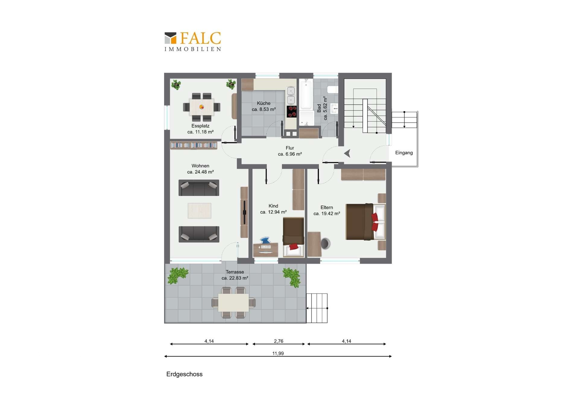 - Ca. 90 m² Wohnfläche im Erdgeschoss mit Terrasse und Gartenzugang