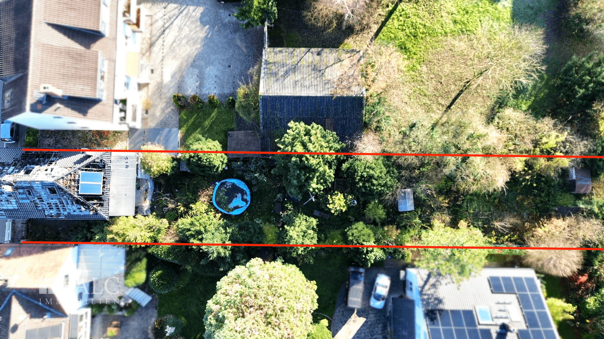 Aus der Vogelperspektive ist die großzügige Ausdehnung des Grundstücks sichtbar. Der vorhandene Baumbestand sorgt für Privatsphäre und eine natürliche Begrünung, die das Gesamtbild harmonisch abrundet.