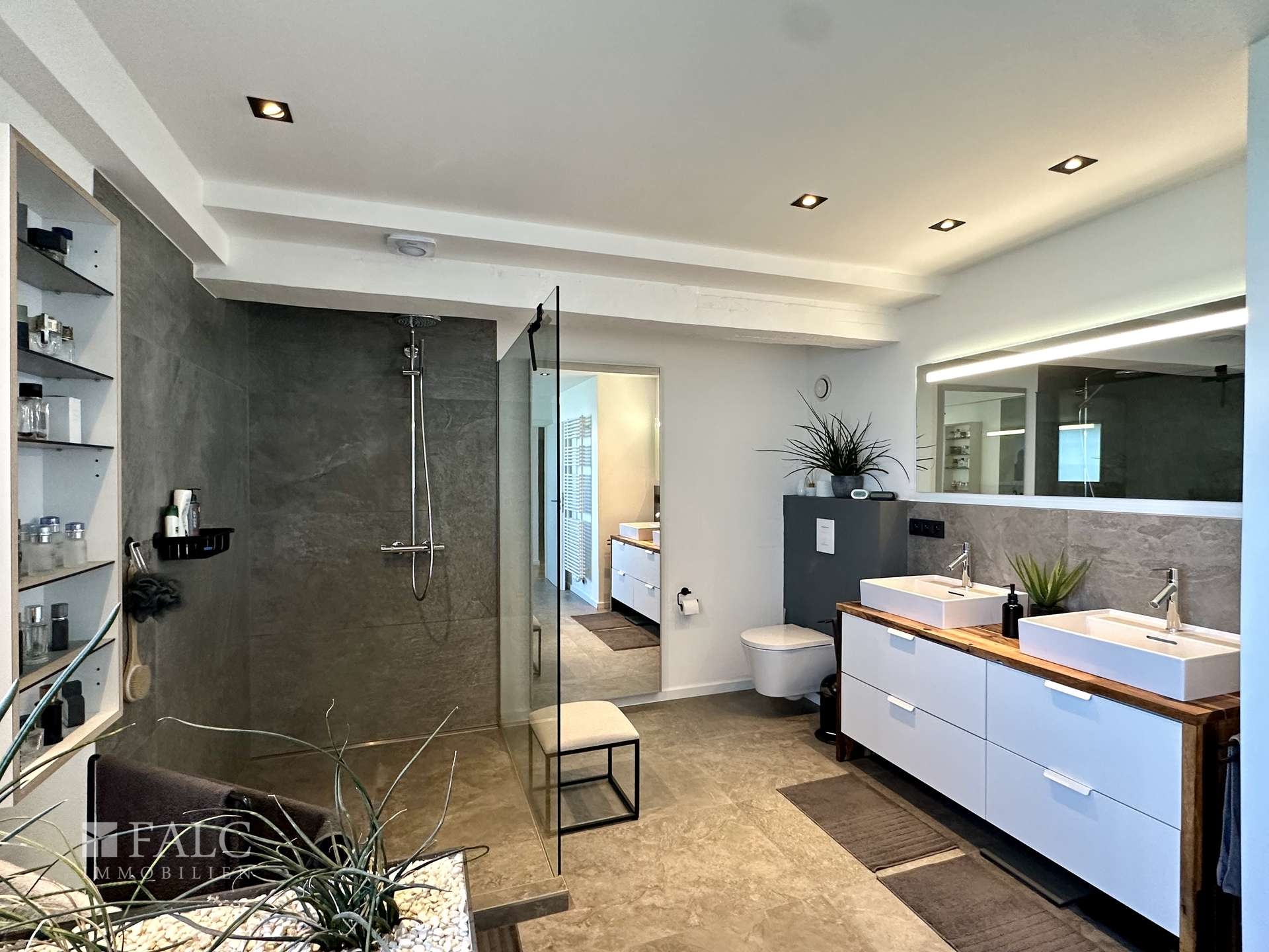 - Bad mit großer ebenerdiger Dusche und Glasabtrennung