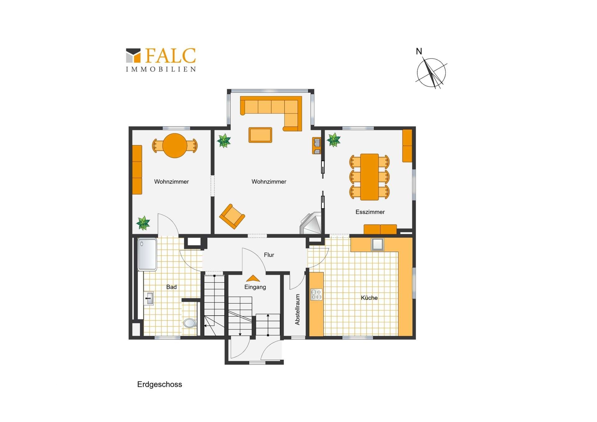 EG: Wohnzimmer, Esszimmer, Küche, Bad, Abstellraum