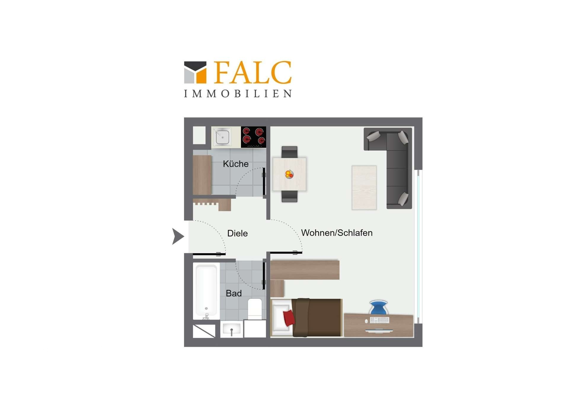 Von dem Eingangsflur mit ausreichend Platz für die Garderobe gelangen Sie linker Hand in die kompakte Küche und rechter Hand das Badezimmer mit Wanne und WC. Geradeaus betreten Sie den geräumigen Wohn- und Schlafraum.