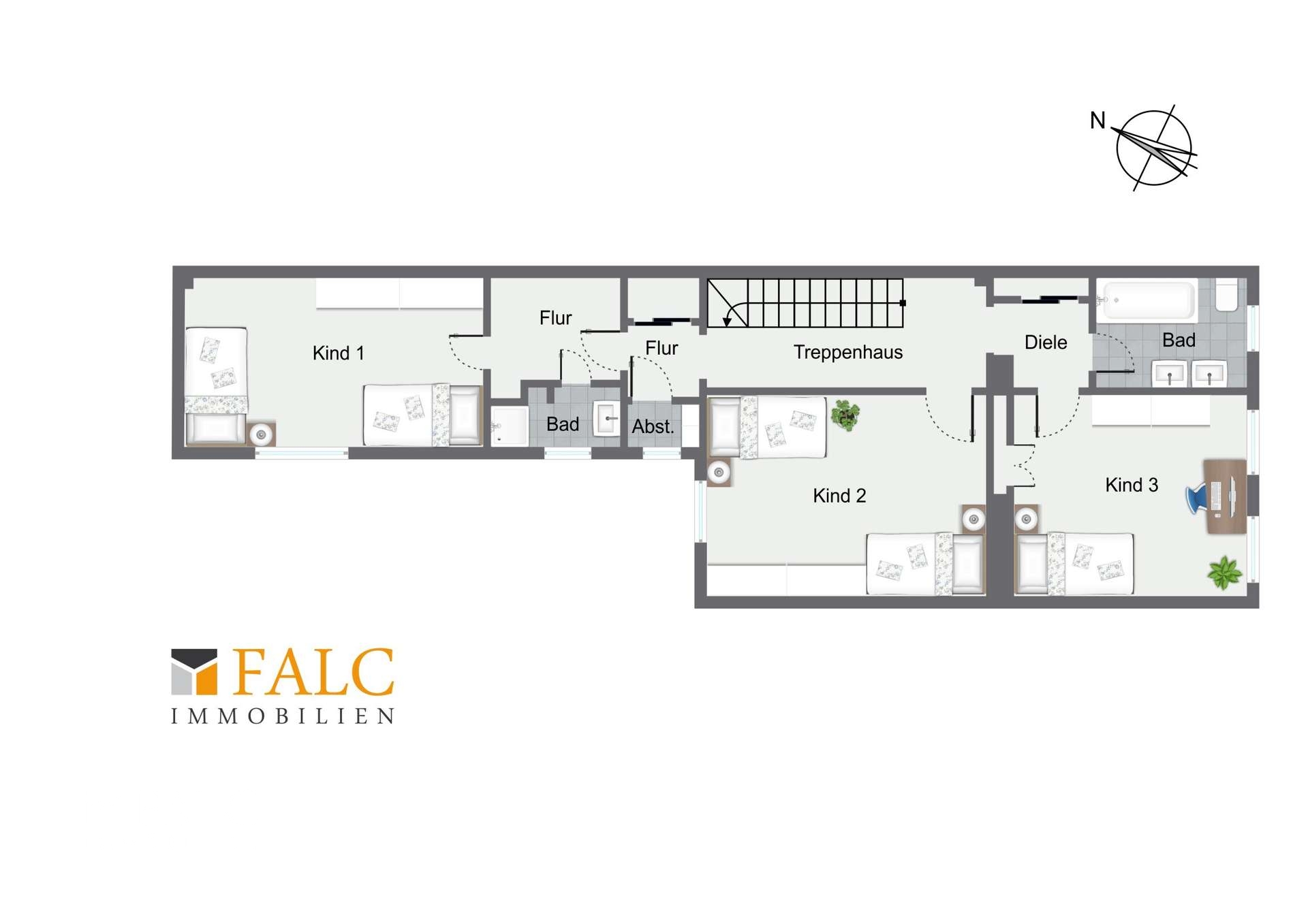 Im zweiten Obergeschoss befinden sich drei als Kinderzimmer genutzte Schlafräume, ein kleines Duschbad mit der Möglichkeit für ein separates WC und ein großes vollwertiges Bad mit Badewanne, WC und zwei Waschtischen.