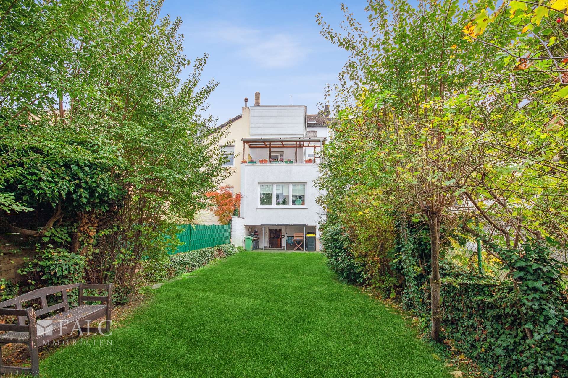 Der lang gestreckte Garten ist von der Erdgeschosswohnung aus über die Terrasse und von der Obergeschosswohnung mittels Wendeltreppe vom Balkon aus zu erreichen. Ebenso gibt es einen Gartenzugang vom Keller aus.
