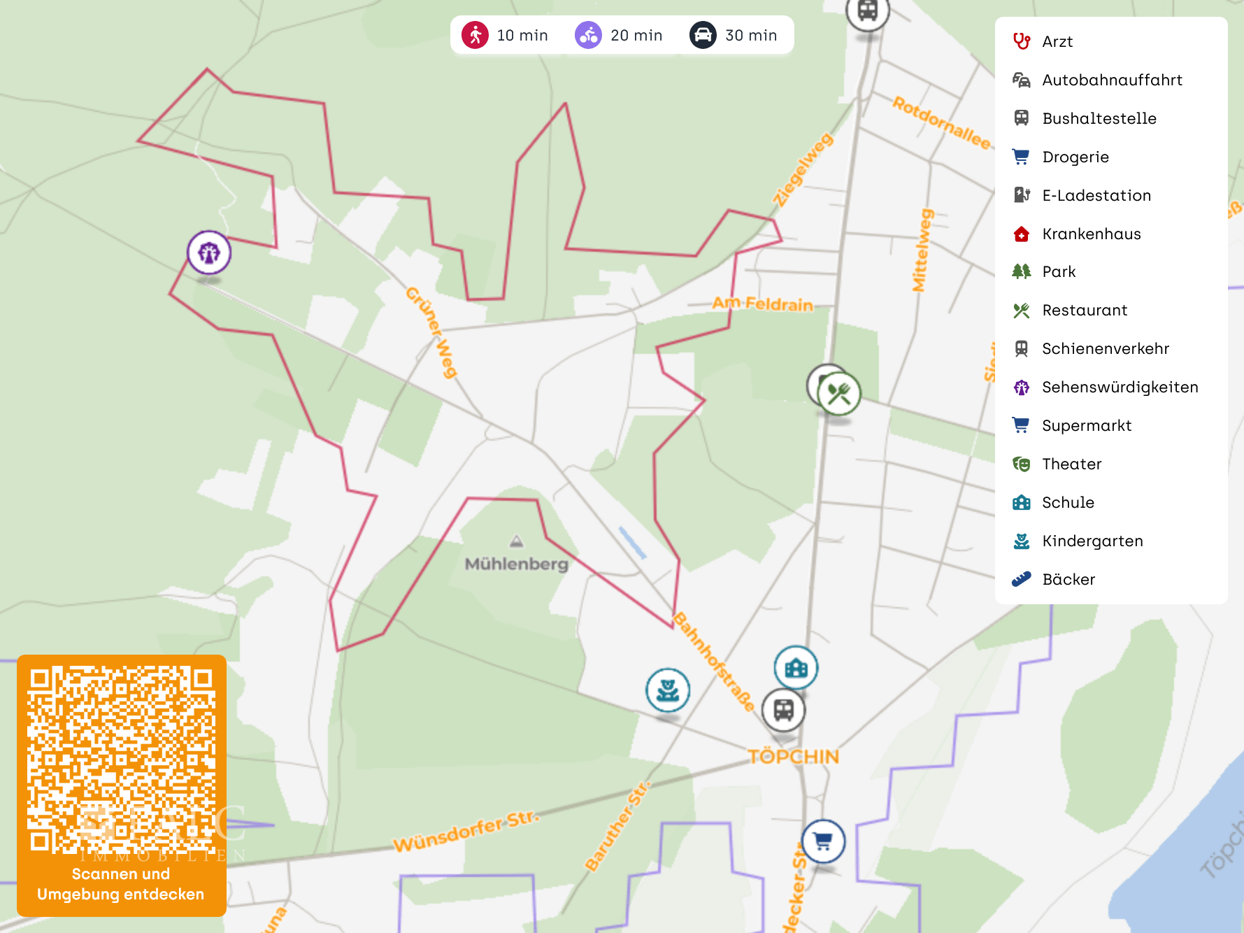 Die Kombination aus ruhiger Wohnlage, erreichbarer Grundversorgung und guter Straßenanbindung schafft ein solides Fundament für stabile Vermietbarkeit. Die im Umfeld ausgewiesene Kaltmiete von ca. 7,90 EUR pro Quadratmeter bietet eine nachvollziehbare Orientierung für die Kalkulation, während die gewachsene Struktur und die familienfreundliche Infrastruktur die Nachfrage stützen. Explizit hervorzuheben sind die Grundschule Töpchin, die Kita Töpchin, der Supermarkt NP Markt sowie die nahe Autobahnauffahrt als zentrale Treiber für Alltagstauglichkeit und Vermietbarkeit.