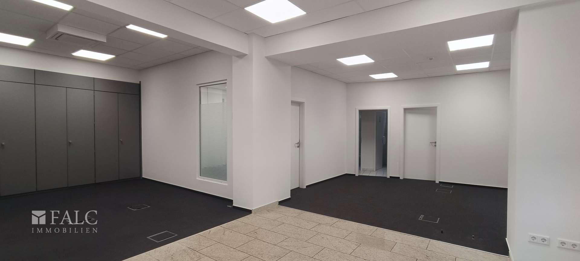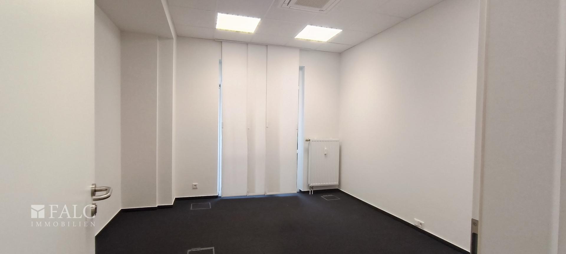 Links befindet sich der erste Büroraum, ideal für konzentriertes Arbeiten. Durch die großen Fenster ist eine angenehme Arbeitsumgebung gegeben. Weiter geht es in den zweiten Büroraum, der ebenfalls gut belichtet ist und Platz für Arbeitsplätze bietet.
