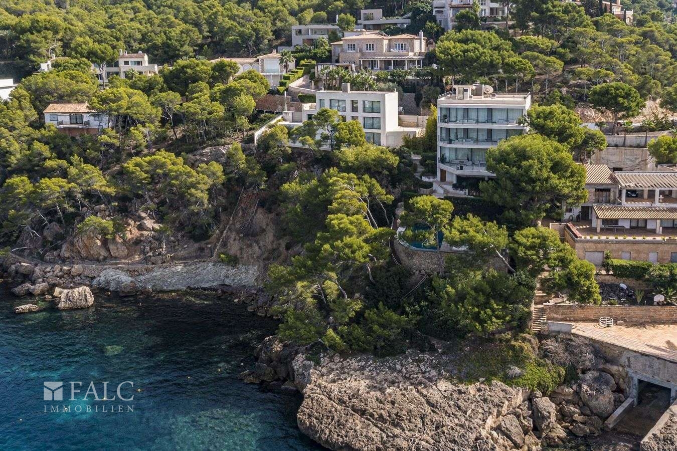 Die erstklassige, eindrucksvolle Luxusvilla mit 4 Etagen und modernem Design in Camp de Mar liegt mitten in der Natur und erhebt sich direkt aus dem Meer über die Felsen. Das prächtige Domizil steht auf einem exklusiven knapp 2.000 m2 grossem Grundstück in der 1. Meereslinie und stellt neben dem Haupthaus von ca. 780 m2 Wohnfläche ein ca. 290 m2 grosses Gästehaus mit einem grosszügigem Wohnzimmer, 3 Schlafzimmern mit en-Suite Duschbädern und einem weiteren Badezimmer bereit. Ferner gibt es hier ein Personal-Apartment mit separaten Eingang, 2 Schlafzimmern, amerikanischer Küche und Badezimmer. Das imposante Haupthaus verfügt im Erdgeschoss über einen noblen, hellen Wohnbereich mit Kamin, Esszimmer mit Kamin, Bulthaupt Küche ausgestattet mit Geräten der Marke Gaggenau, Gäste-Bad und eine direkt mit dem Meer verbundene Terrasse mit Infinitypool. In der 1. Etage liegt das Masterschlafzimmer (ca. 114 m2) mit integrierter Lounge und eigener Terrasse über dem Meer und mit 2 voll ausgestatteten Bädern en-Suite mit freistehender Meerblick-Badewanne. Die 2. Etage beherbergt 3 grosse Schlafzimmer mit Duschbädern en Suite. Die 3. Etage beherbergt die 200 m2 Dachterrasse mit atemberaubender 360-Grad Panorma-Aussicht. Im Untergeschoss liegt der Spa-Bereich mit Hallenbad und Sauna. Die Luxus-Immobilie mit Domotik-System ist sehr hochwertig ausgestattet. In beiden Villen sind die Etagen per Aufzug verbunden.