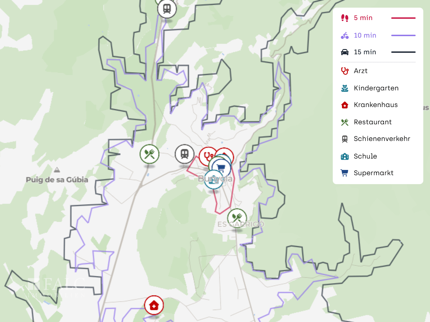 Die Anbindung ist alltagstauglich und flexibel. Eine Bushaltestelle wie Sa Plaça Bunyola liegt fußläufig, und der Bahnhof Bunyola ist ebenfalls in der Nähe, ideal für Fahrten Richtung Palma oder in die Inselmitte. Mit dem Auto erreichen Sie die Verbindungsstraße Ma 11 Richtung Palma und Sóller in kurzer Zeit. Der Flughafen Palma de Mallorca ist je nach Verkehr in etwa 25 bis 30 Minuten erreichbar, was den Standort auch für Pendler und Zweitwohnsitznutzer interessant macht.