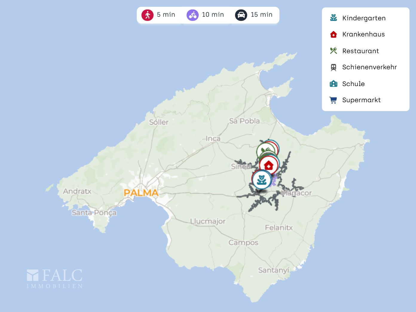 Freizeit und Umgebung bieten eine abwechslungsreiche Mischung aus Natur, kleinen Ausflugszielen und mallorquinischer Kultur. Ob Spaziergänge und Radtouren durch die sanfte Hügellandschaft, ein Bummel durch die umliegenden Orte oder ein Tagesausflug an die Küste: Die Lage unterstützt einen Alltag, der Ruhe und Abwechslung gut miteinander verbindet.