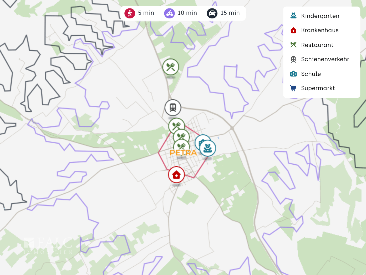 Für die tägliche Versorgung ist Petra gut aufgestellt: Einkaufsmöglichkeiten für den Grundbedarf sowie weitere Angebote des täglichen Lebens sind in der Nähe erreichbar. Auch Dienstleistungen wie Geldautomat und weitere Besorgungen lassen sich im Ort und im näheren Umkreis unkompliziert erledigen.