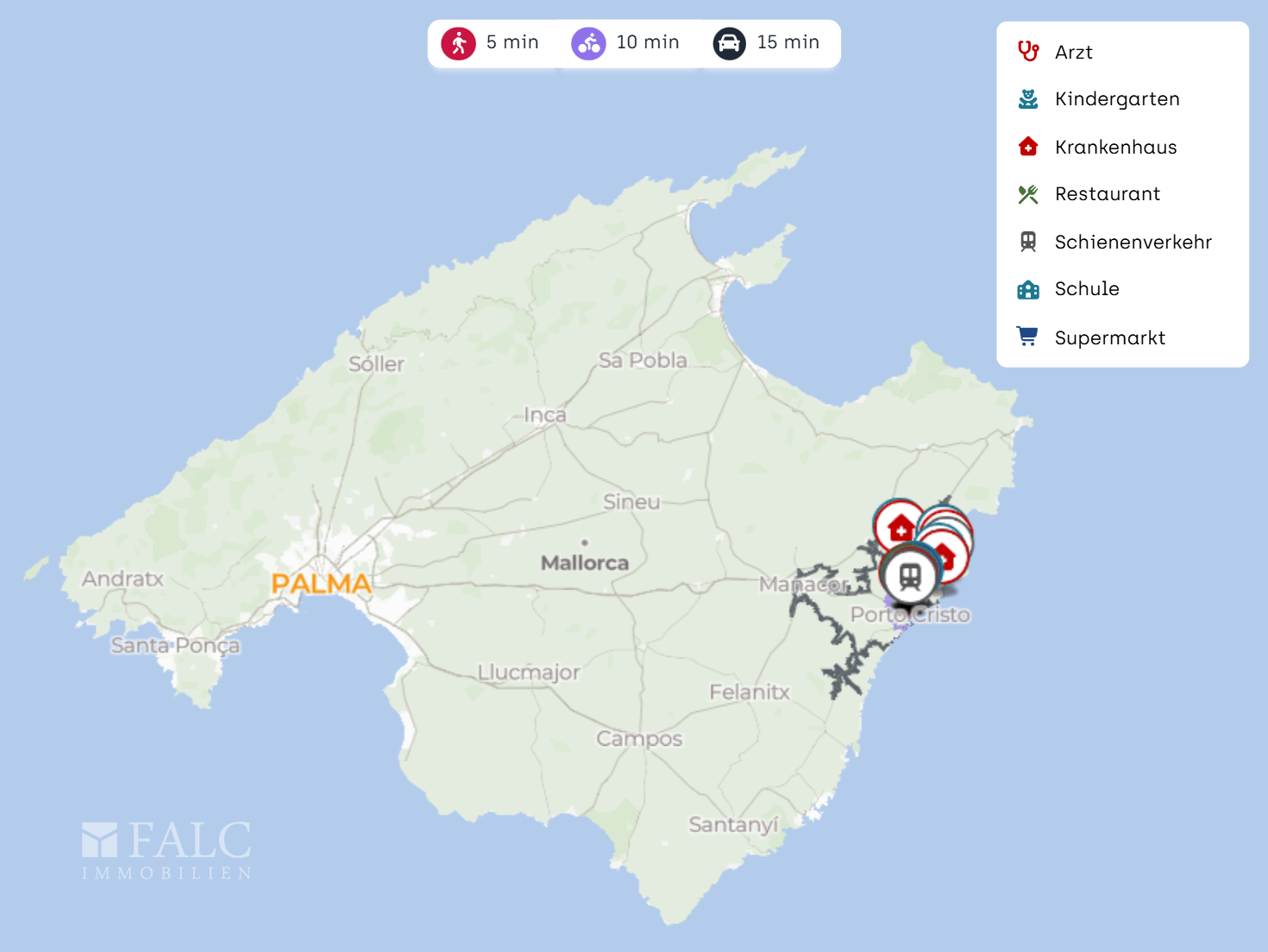 Für die medizinische Versorgung ist ebenfalls gesorgt. Das Hospital de Llevant liegt in ca. 100 m, das Centre de Salut in ca. 700 m. Damit verbindet die Lage kurze Wege im Alltag mit attraktiven Zielen in der näheren Umgebung und einer guten Erreichbarkeit innerhalb der Insel.
