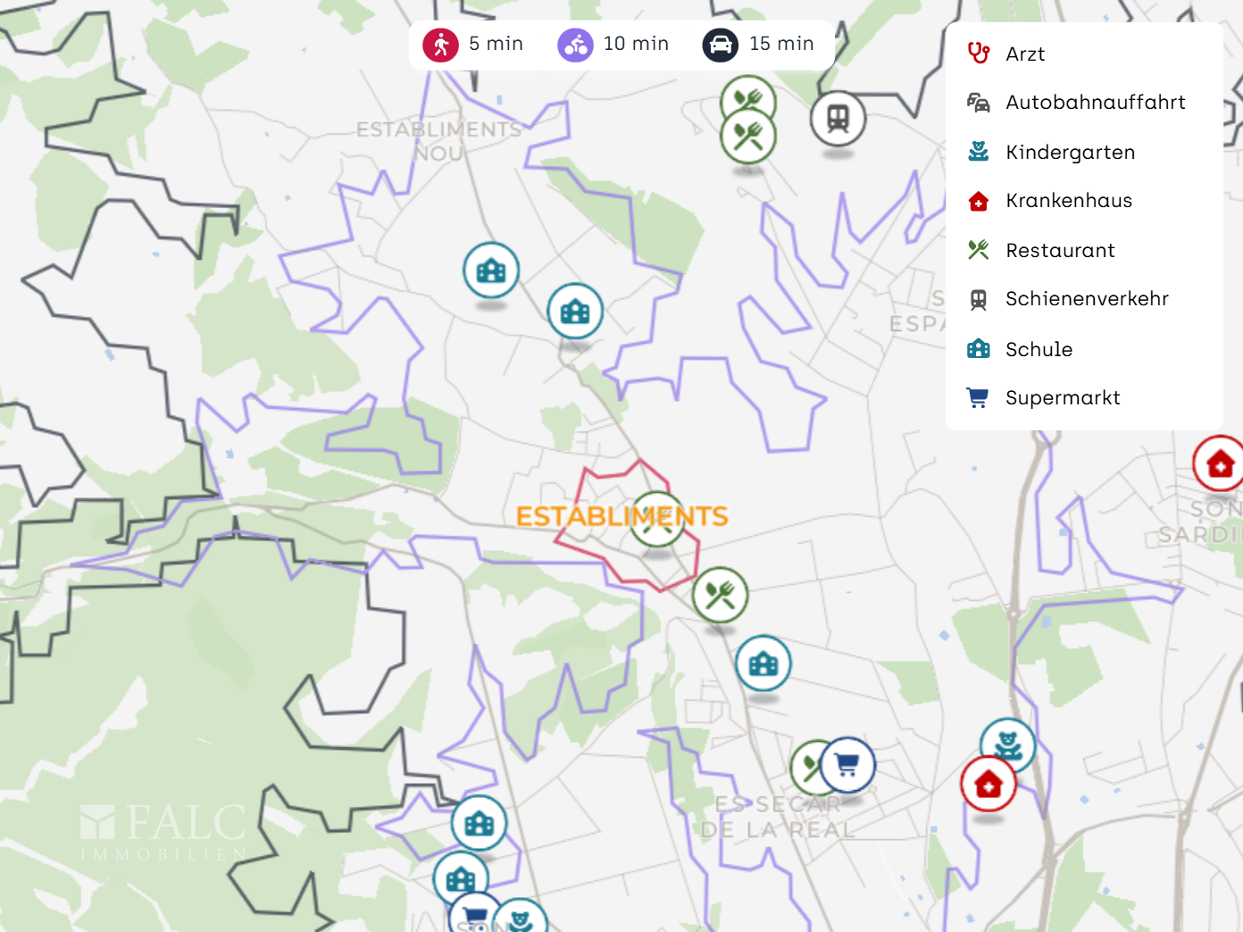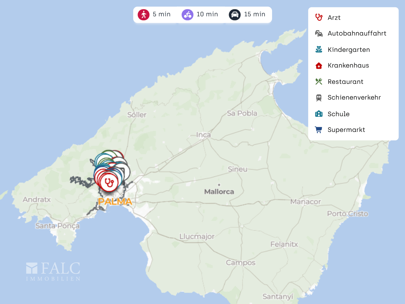 Die Immobilie liegt in Establiments, einem angenehm ruhigen Wohngebiet am westlichen Stadtrand von Palma, das ländliche Gelassenheit mit einer alltagstauglichen Infrastruktur verbindet. Für den täglichen Bedarf ist vieles schnell erreichbar: Eine Bushaltestelle an der Carretera d’Esporles befindet sich in wenigen Gehminuten, sodass Sie bequem Richtung Palma und in die umliegenden Stadtteile gelangen. Auch mit dem Auto sind Sie zügig unterwegs, denn die Auffahrt zur Ma 20 liegt nur wenige Minuten entfernt und schafft eine gute Anbindung an das Stadtgebiet sowie an weitere Ziele auf der Insel.