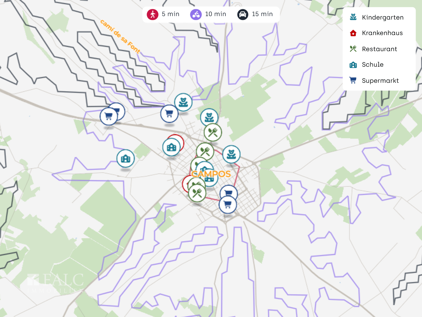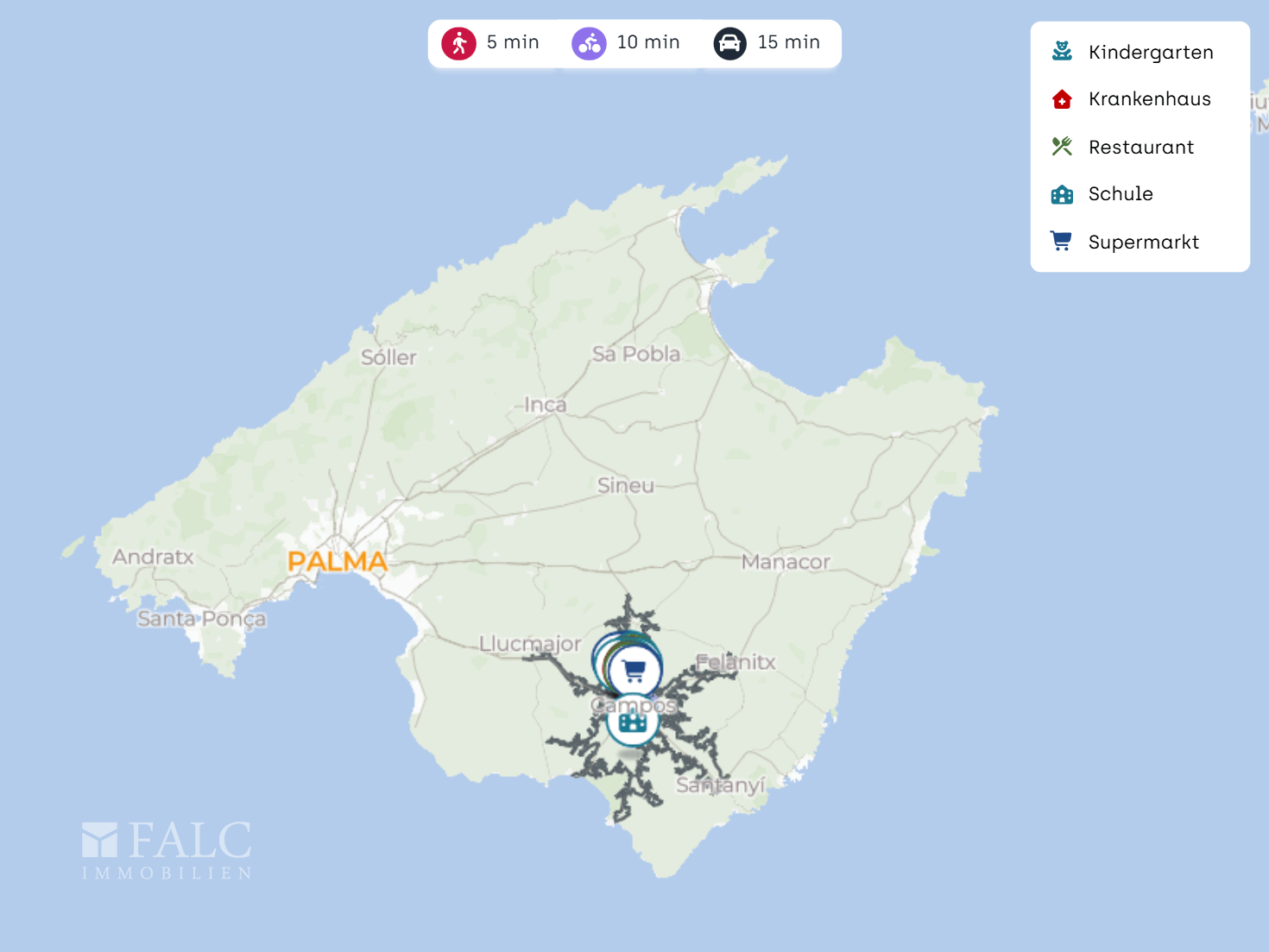 Die Immobilie liegt in Campos und verbindet kurze Wege im Ort mit einem angenehm ruhigen Wohnumfeld. Viele Dinge des täglichen Bedarfs lassen sich bequem zu Fuß erledigen: Ein Café wie ses Voltes sowie mehrere Bäcker, darunter Pomar und Can Lluís, befinden sich in der Nähe und machen den Start in den Tag besonders unkompliziert. Für den schnellen Einkauf stehen Supermärkte wie Suma und Hiper Centro in wenigen Minuten zur Verfügung.